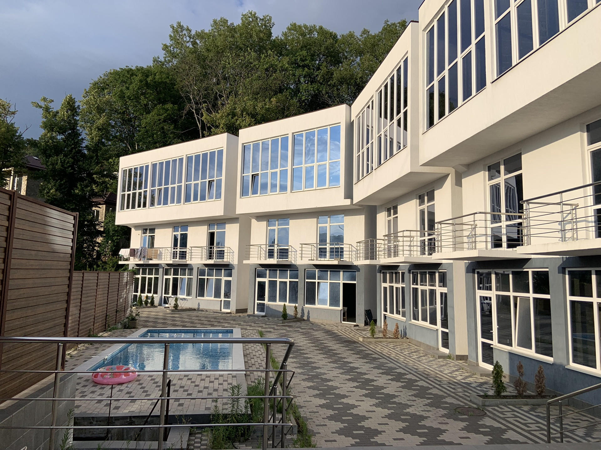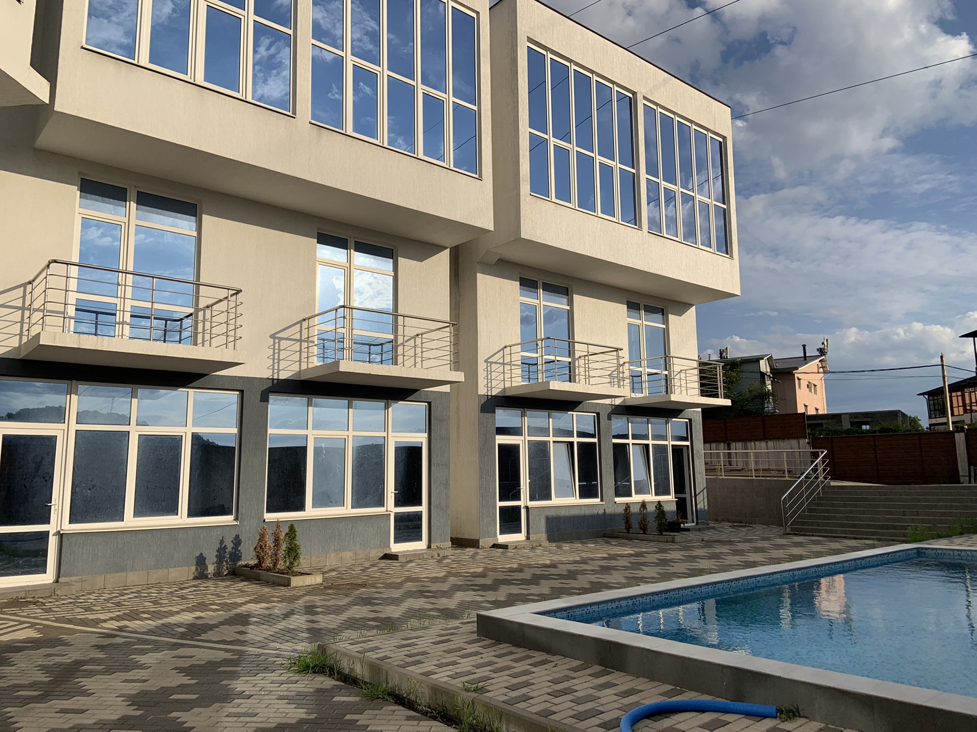 У таунхауса есть небольшая терраса. На территории парковка на 18 машиномест, бассейн и зона барбекю.