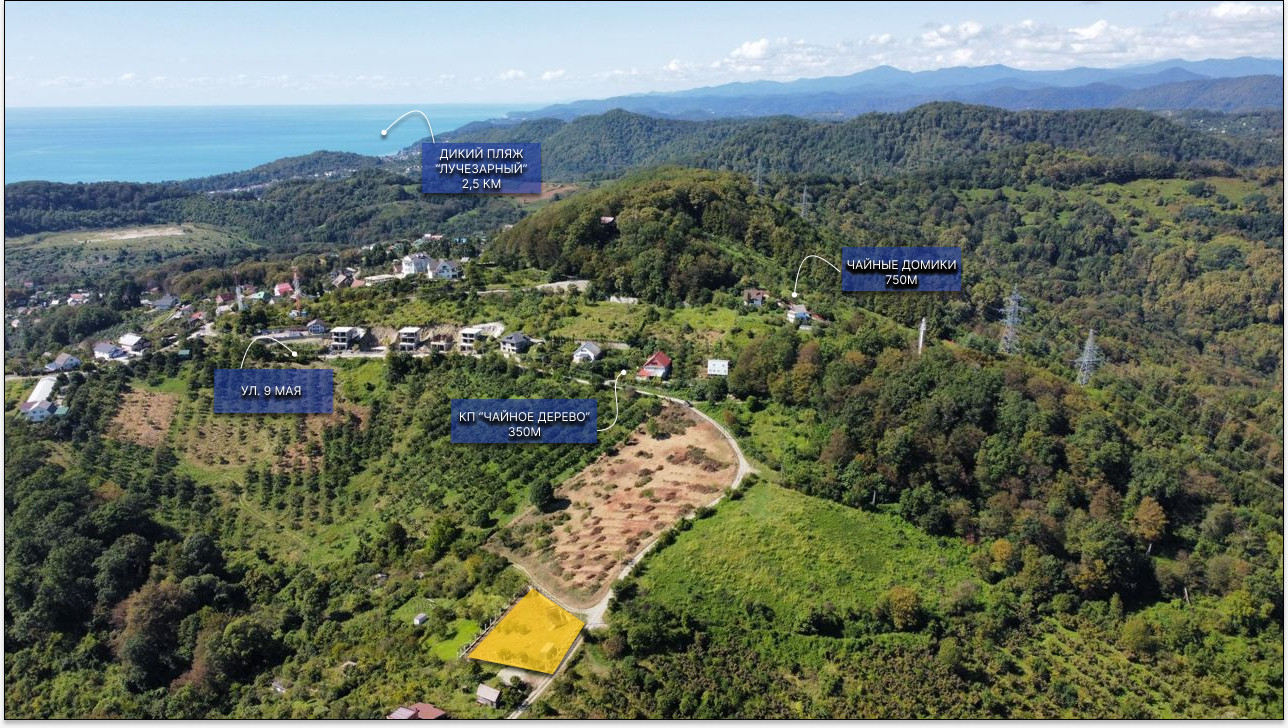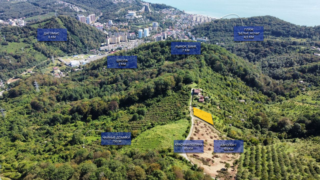 В поселке ходит автобус, есть станция электропоездов. Недалеко от участка есть несколько магазинов. До Дагомыса 5 км, до Сочи всего 19 км, 5 минут езды до моря на авто.