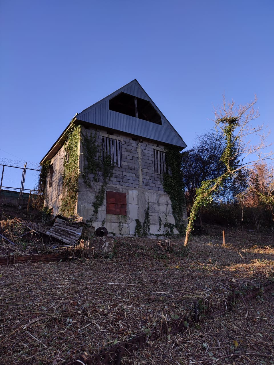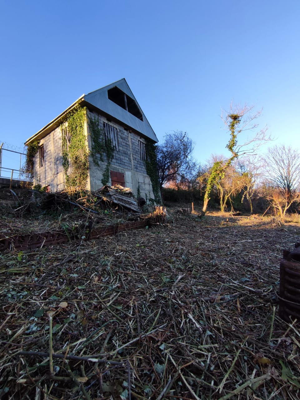 На участке стоит дом 86 м2. 3 этажа. Черновой.