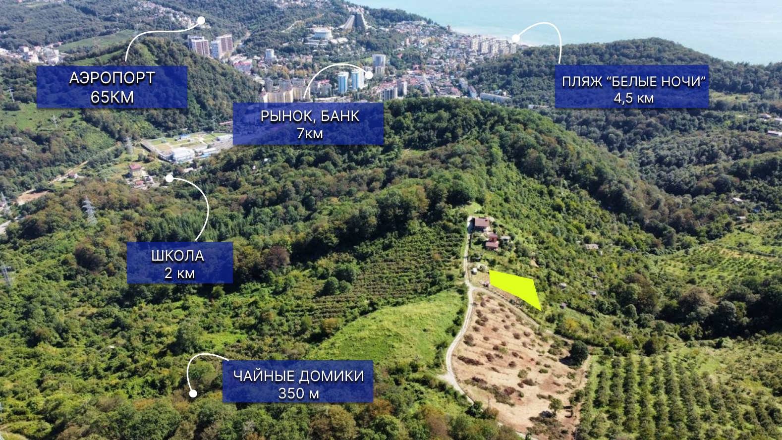 У участка самое лучшее расположение в Уч-Дере, находится в тупике, на холме, соседей немного, но статусные. Имеет два подъезда. Очень красивые виды на Черное море и горы Кавказа.