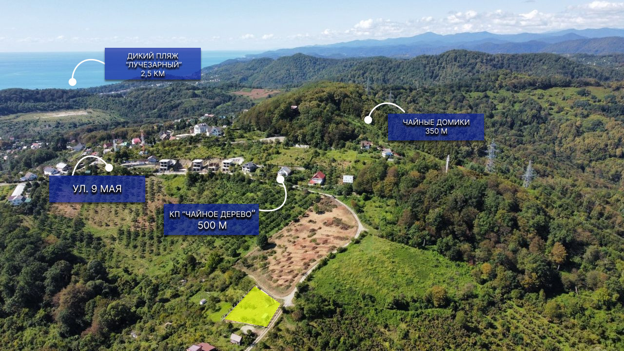 В поселке ходит автобус, есть станция электропоездов. Недалеко от участка есть несколько магазинов. До Дагомыса 5 км, до Сочи всего 19 км, 5 минут езды до моря на авто.