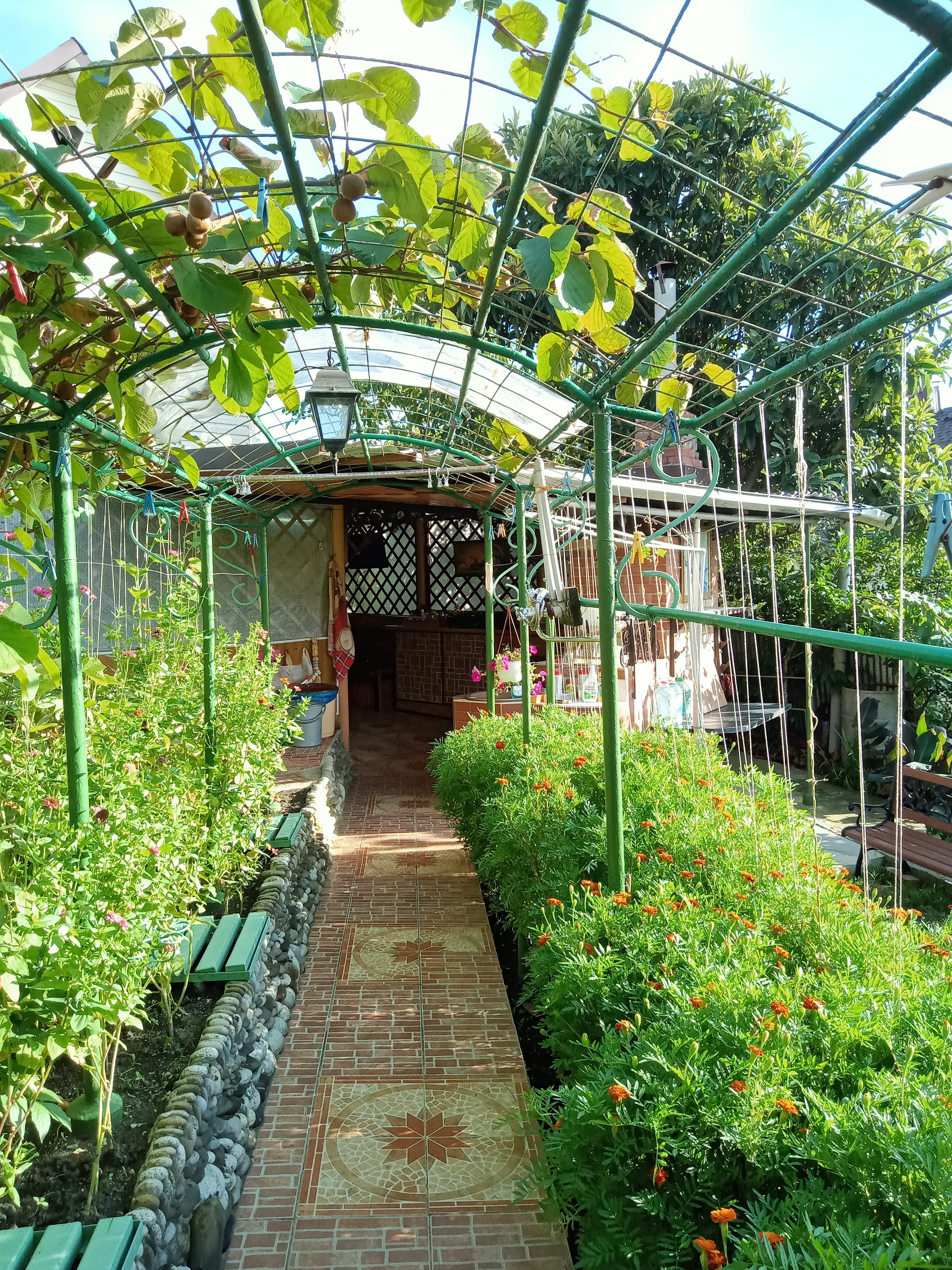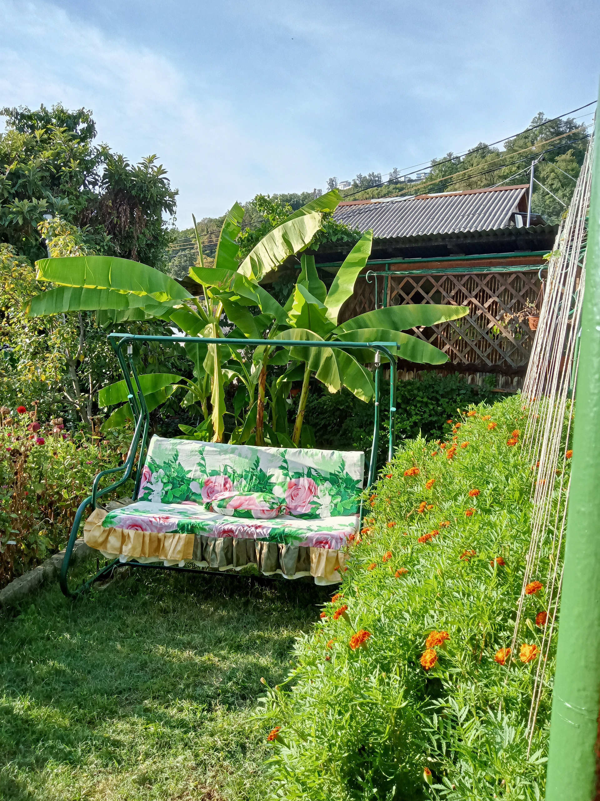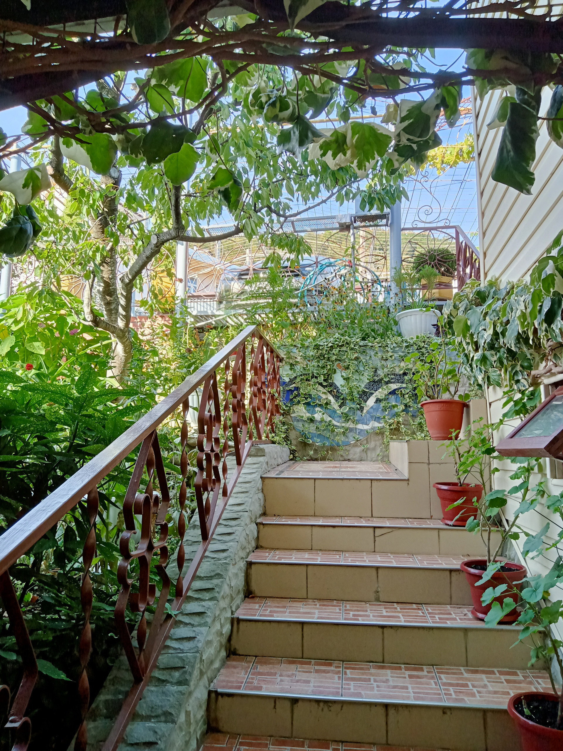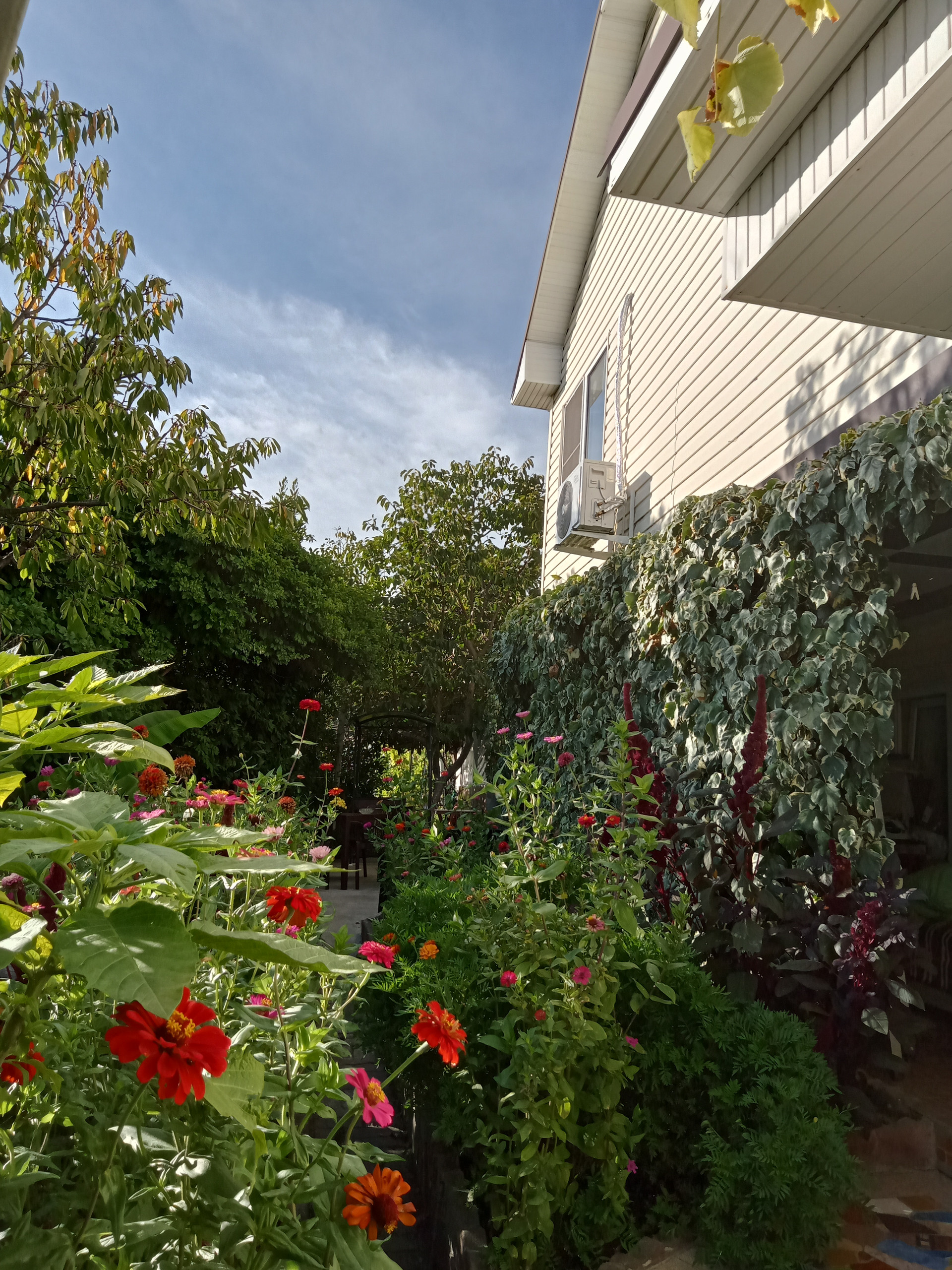 На территории много плодовых деревьев. Много цветов.