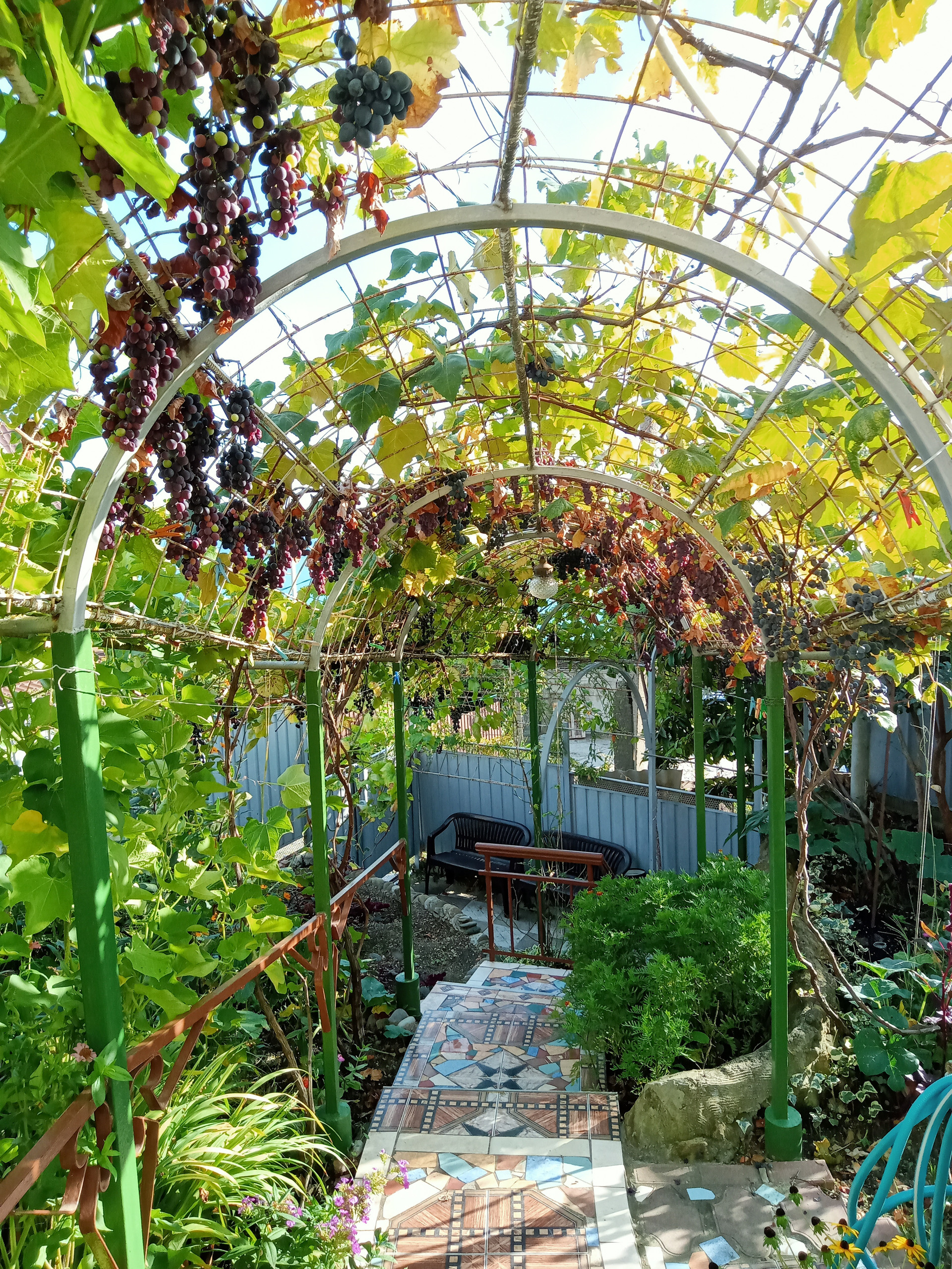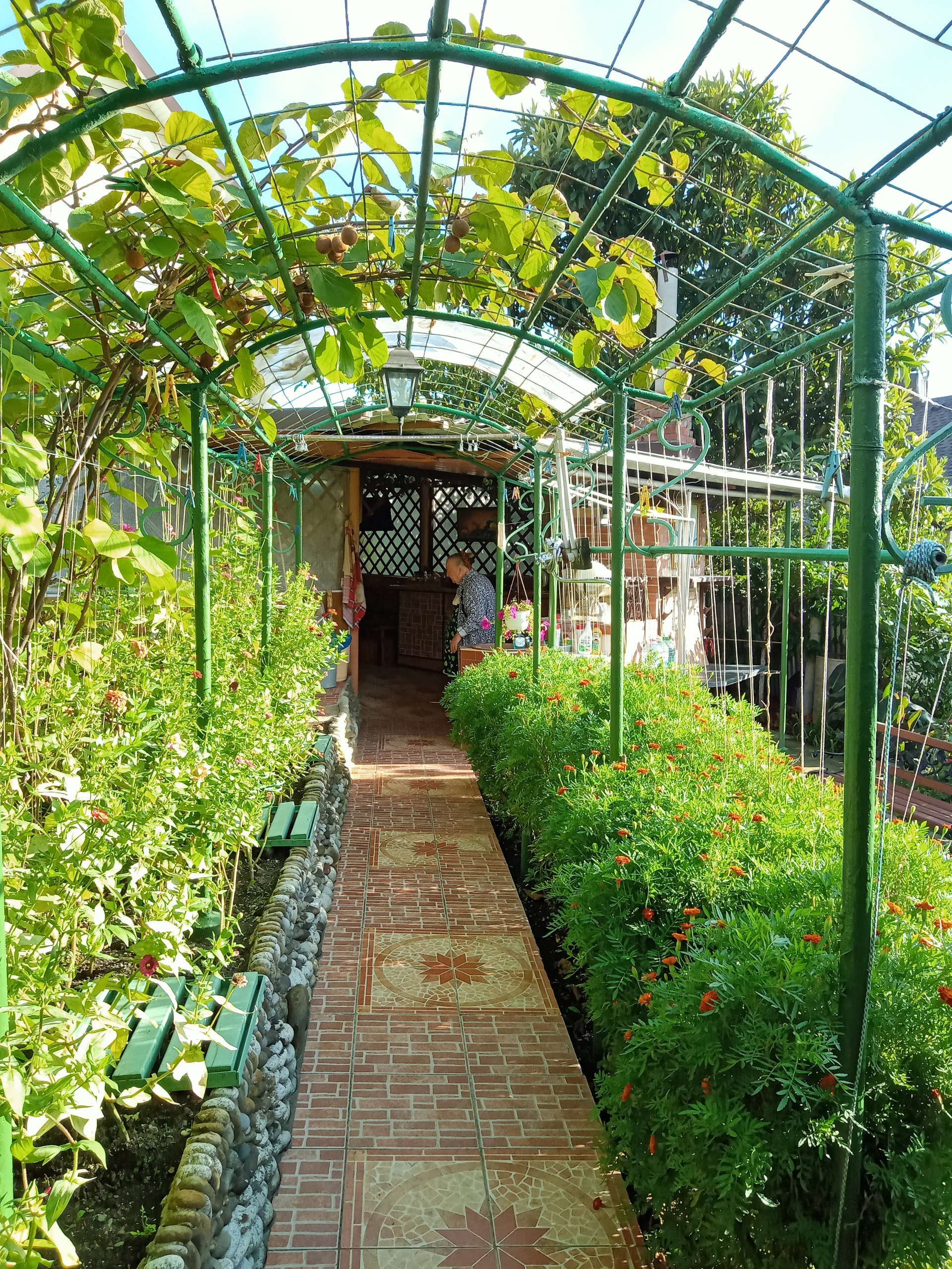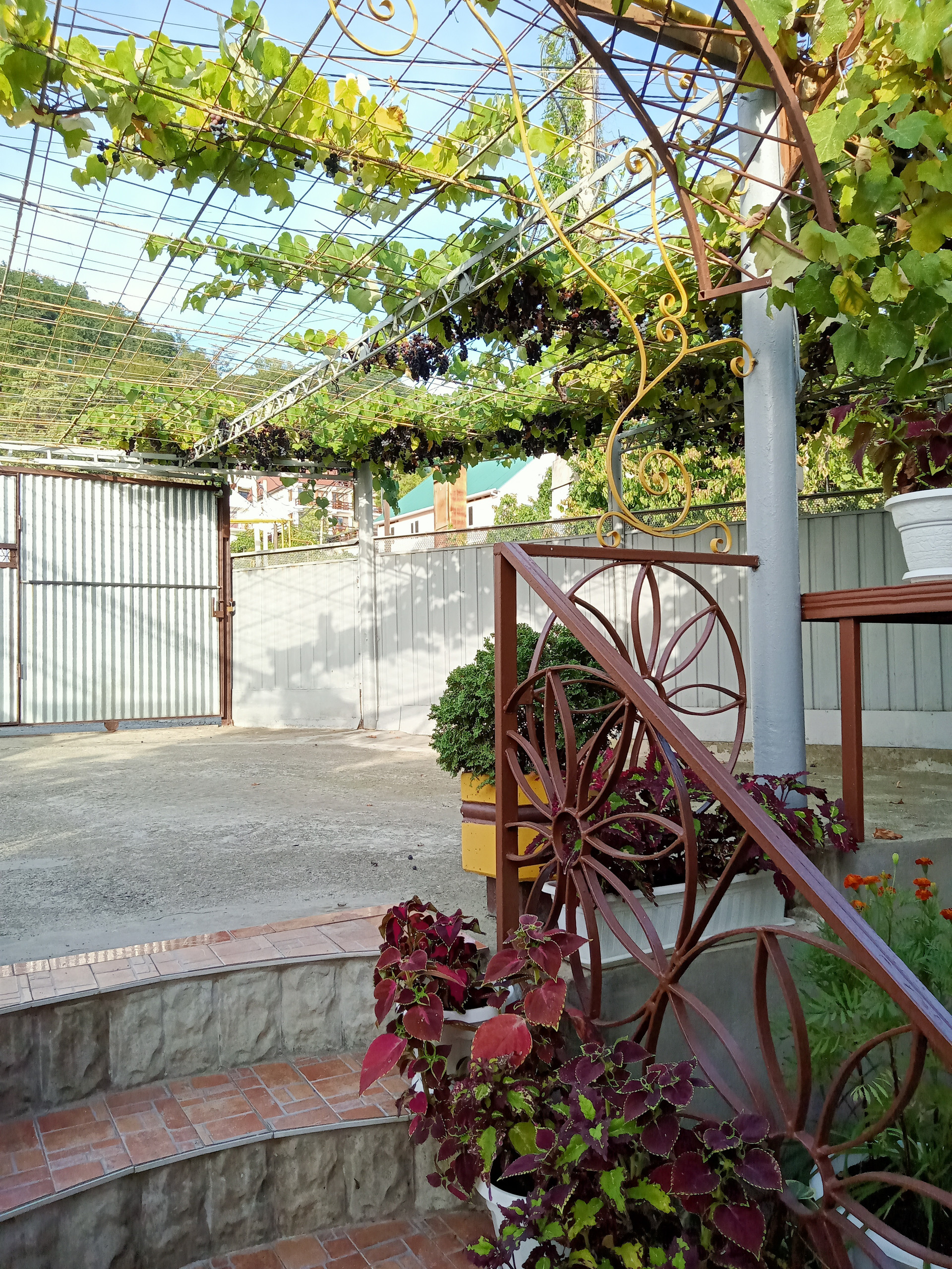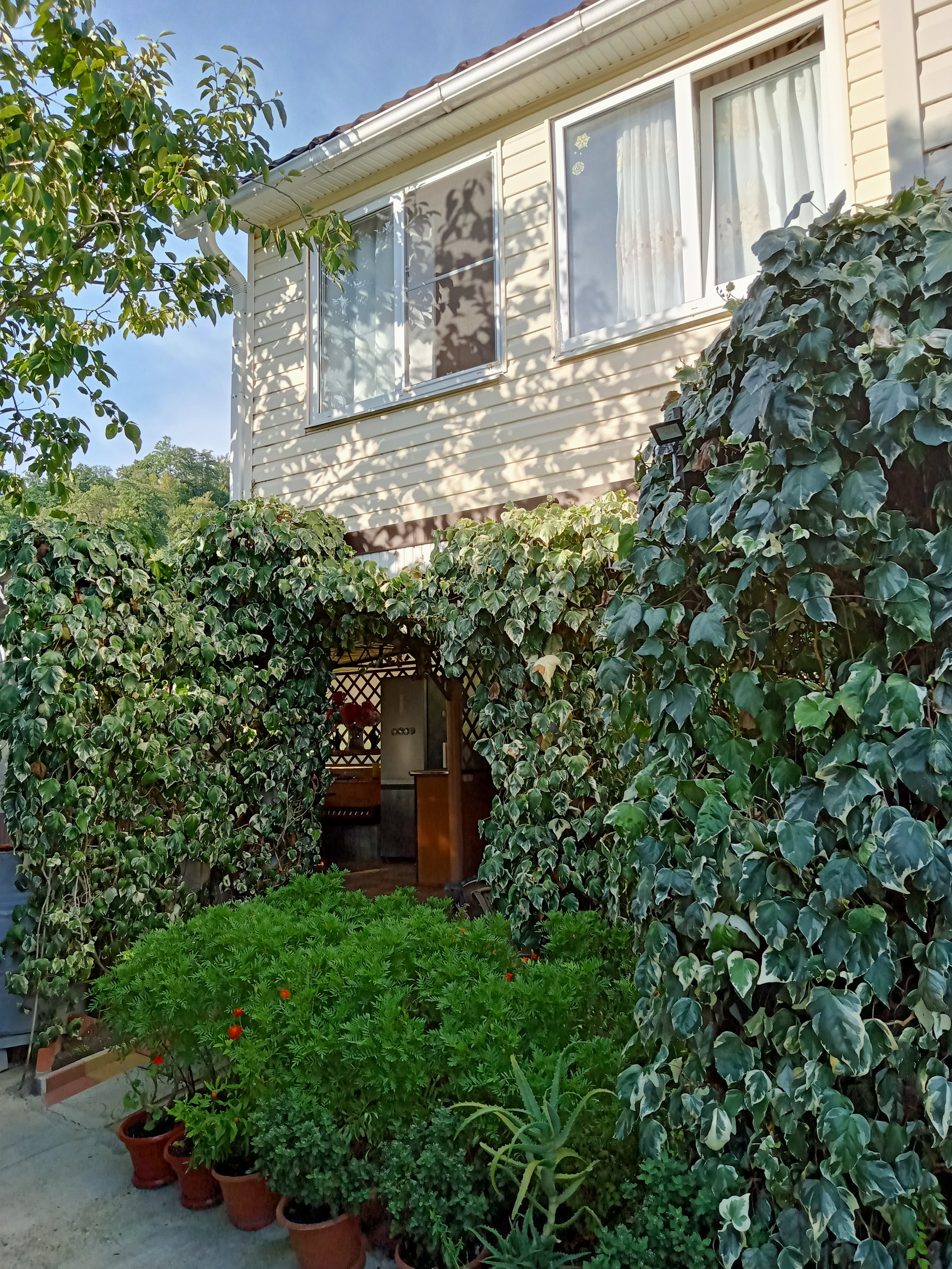 На территории много плодовых деревьев. Много цветов.