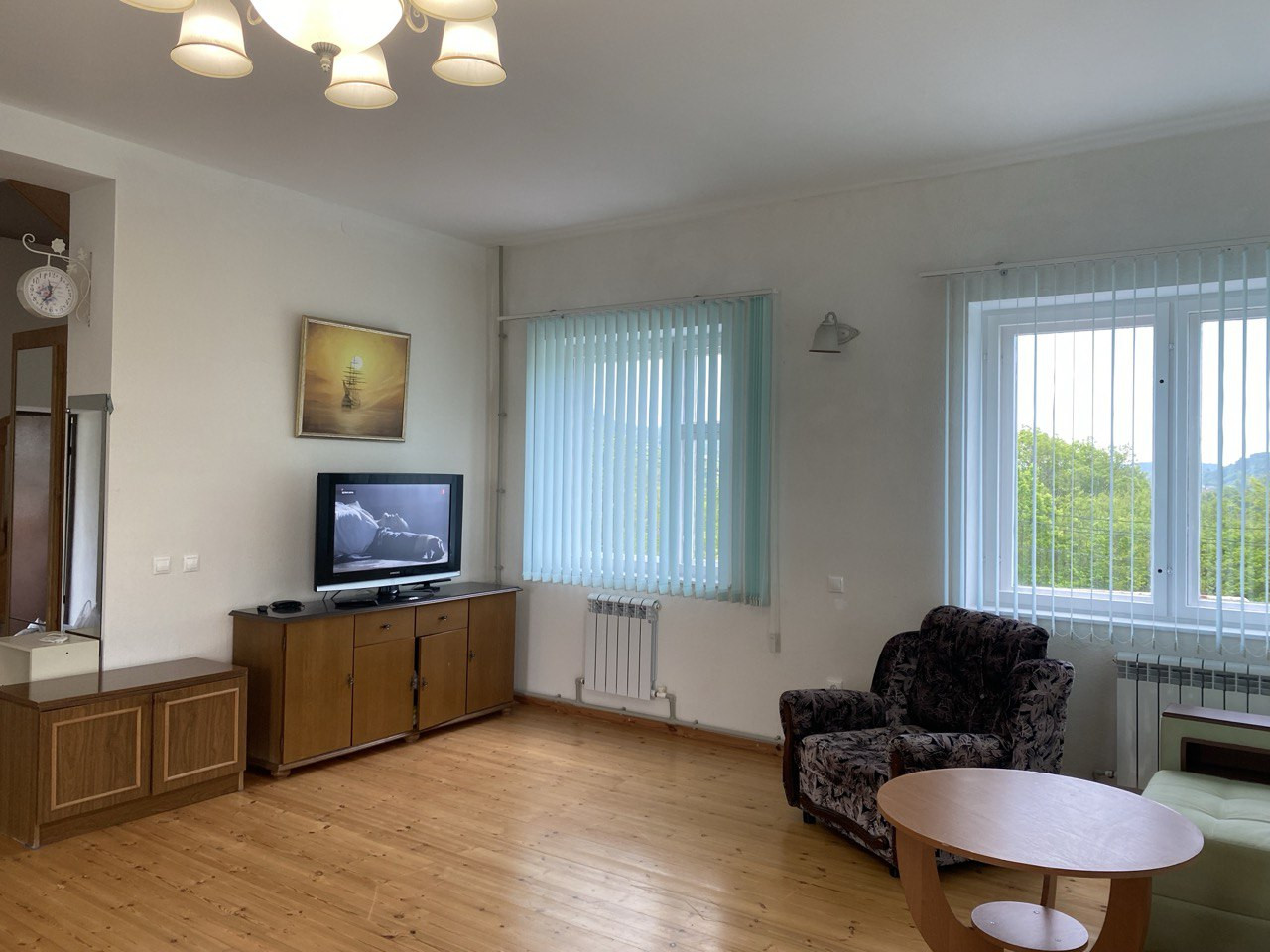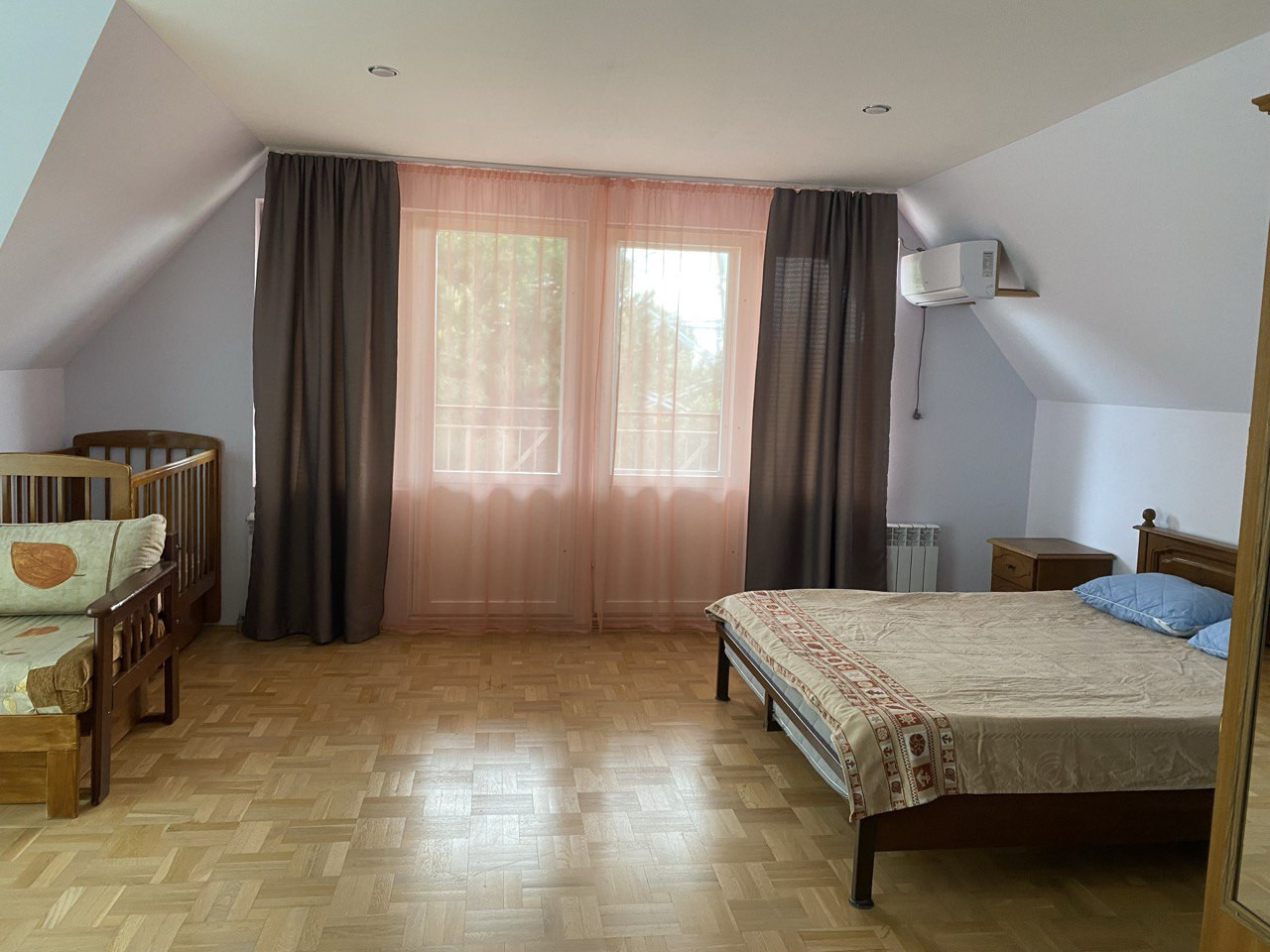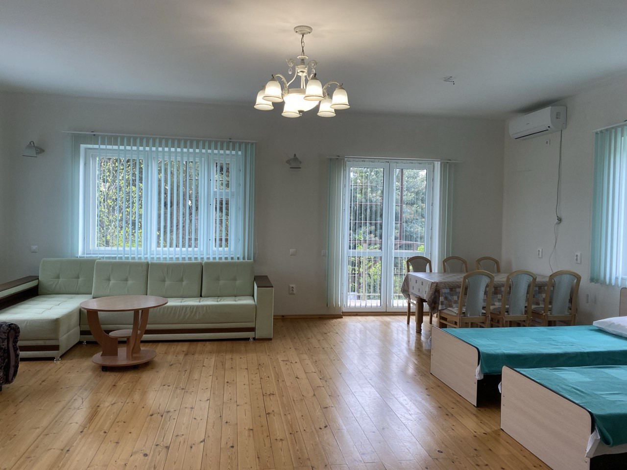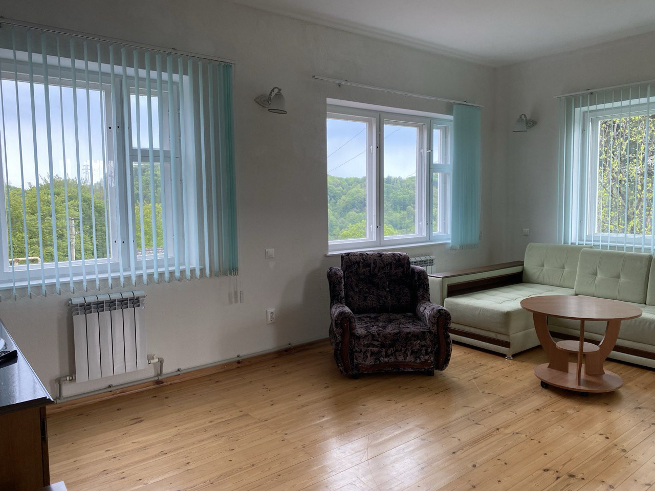 Комнаты в доме просторные, большой зал около 40 кв. м., на каждом этаже санузлы, горячая вода круглосуточно, полы и окна из дерева. Кондиционеры, стиральная машинка-автомат, телевизор, все необходимое для проживания имеется.