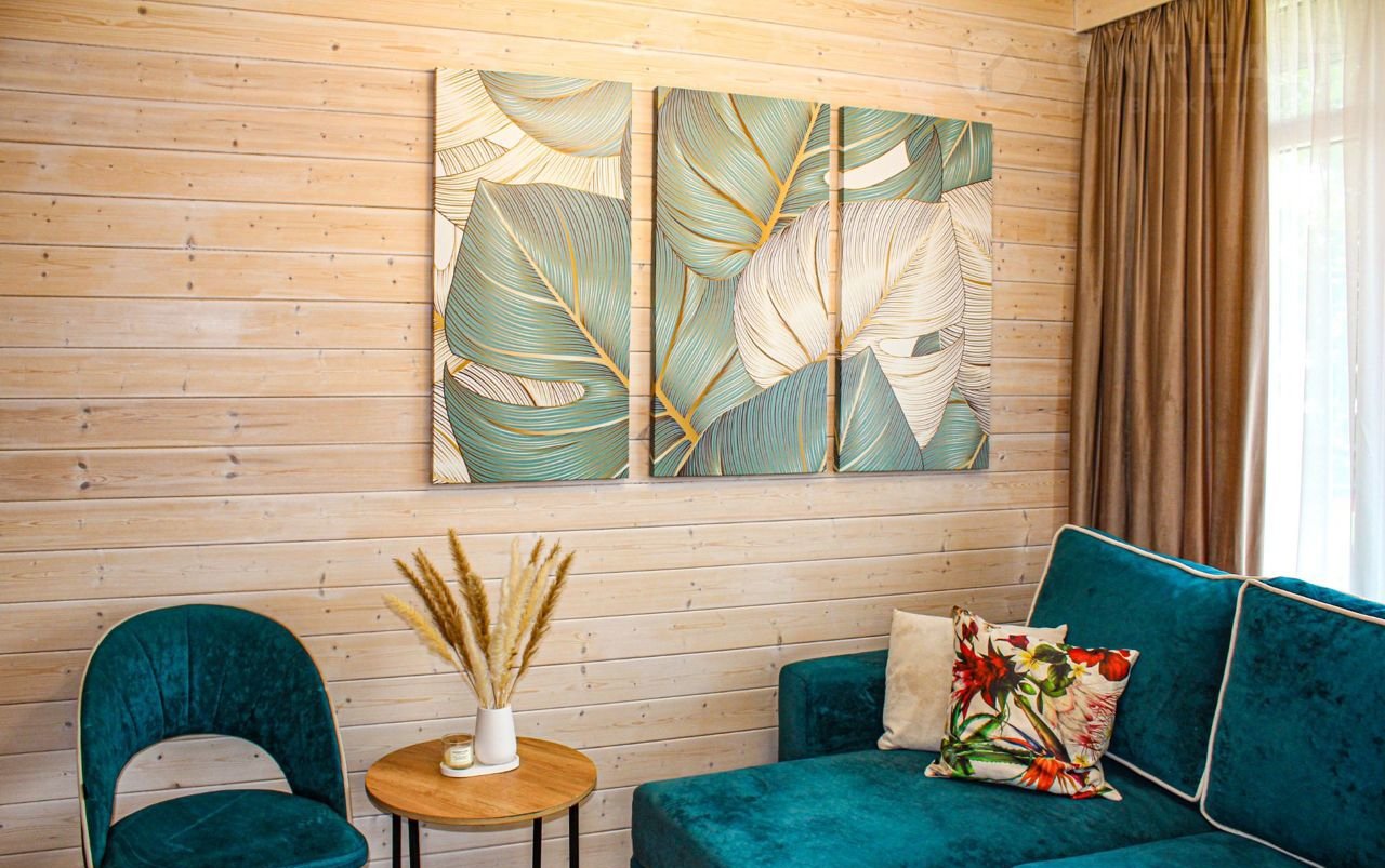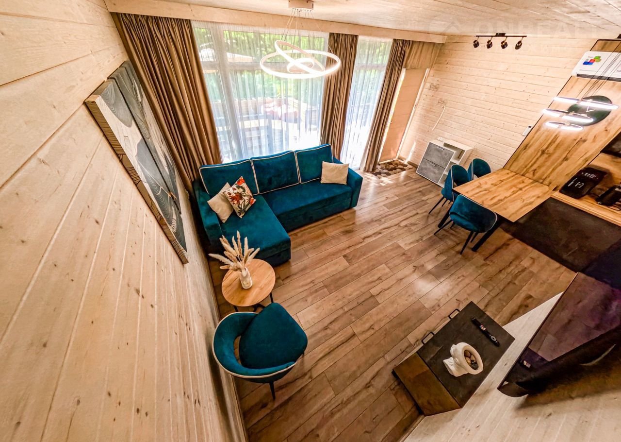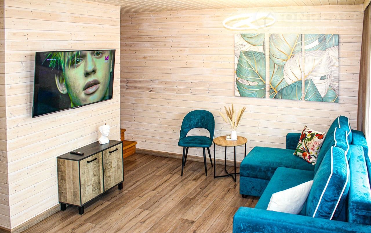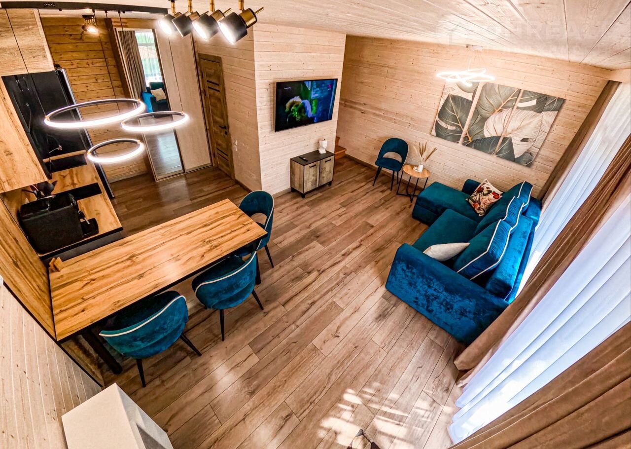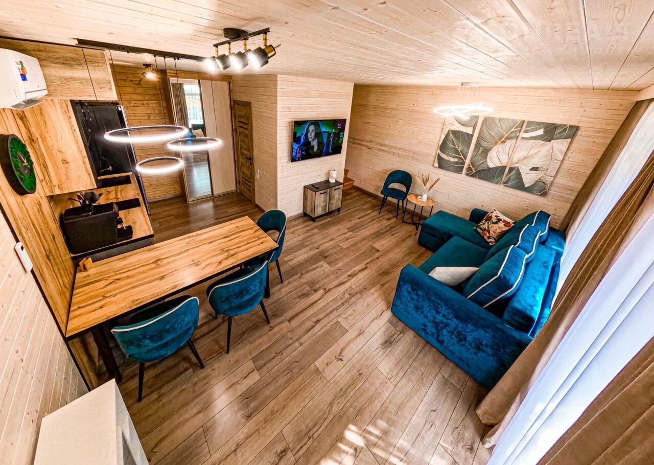-На 1 этаже просторная гостиная с кухней, большой раскладной диван