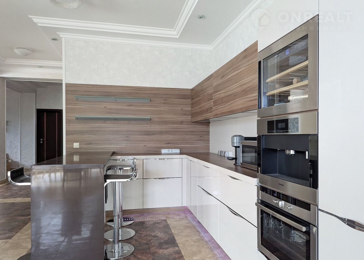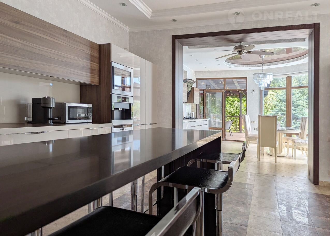 На первом этаже: холл, гостиная с камином, кухня-столовая, санузел. Кухня оснащена всем необходимым: от посудомоечной и кофемашины до винного шкафа, а также живописной столовой зоной.