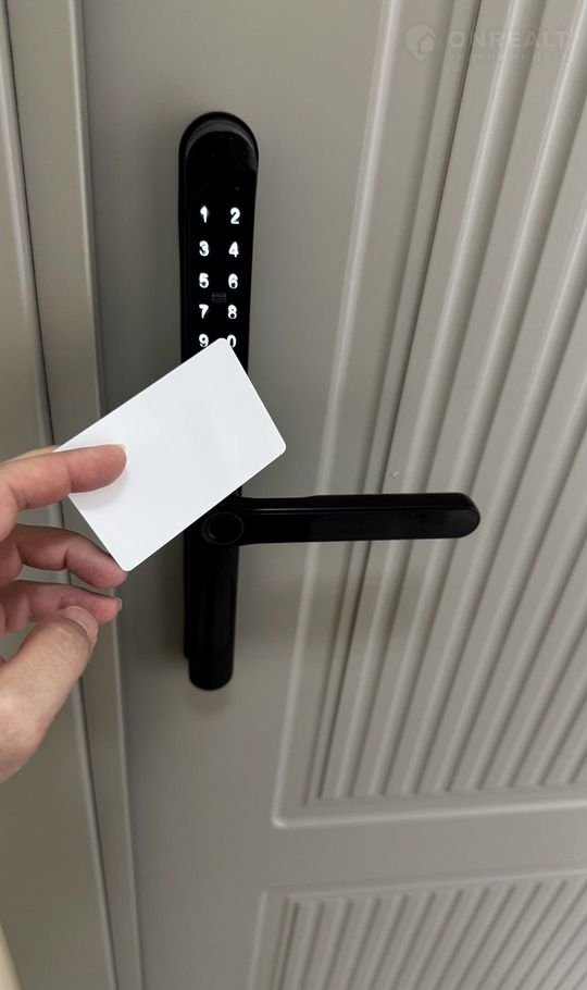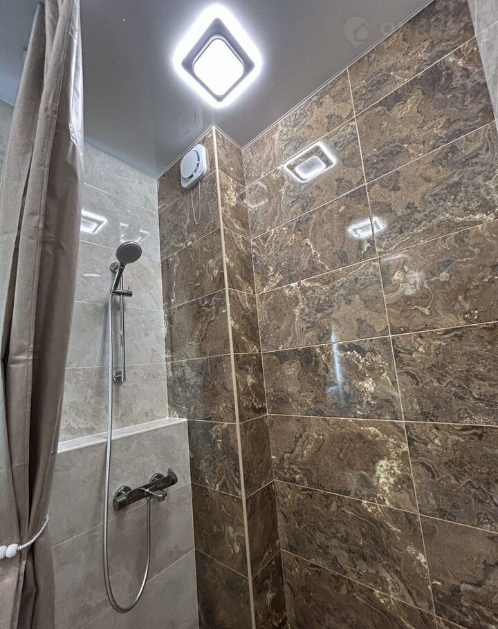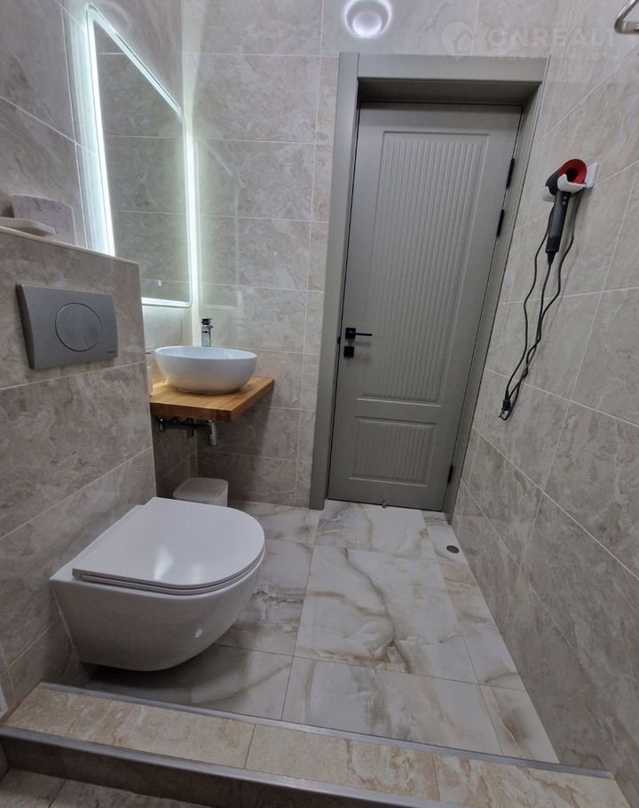 Санузел современный, с душевой кабиной и стильной отделкой. В наличии стиральная машина и средства гигиены.
