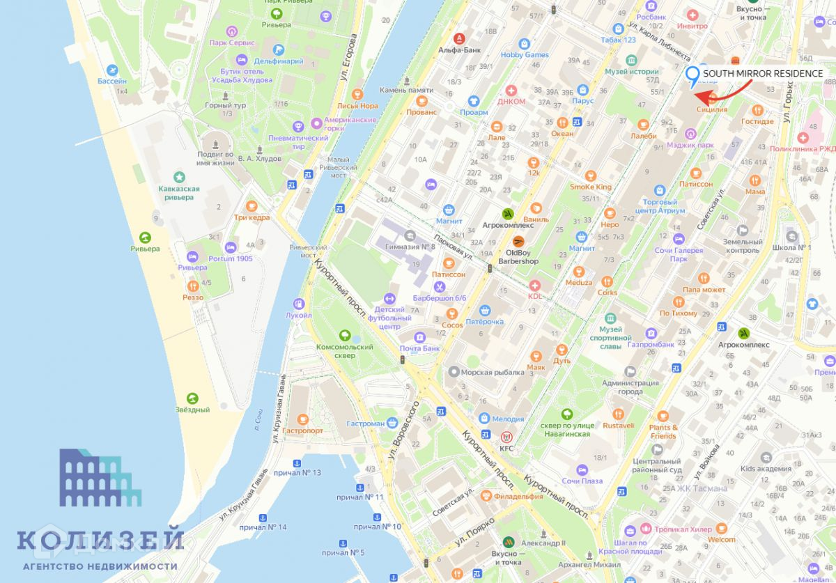 Отличная локация, в шаговой доступности: Пешеходная Навагинская улица, Морпорт Сочи, Парк Ривьера, ТЦ Моремолл, Центральная набережная, Magic Park для детей.