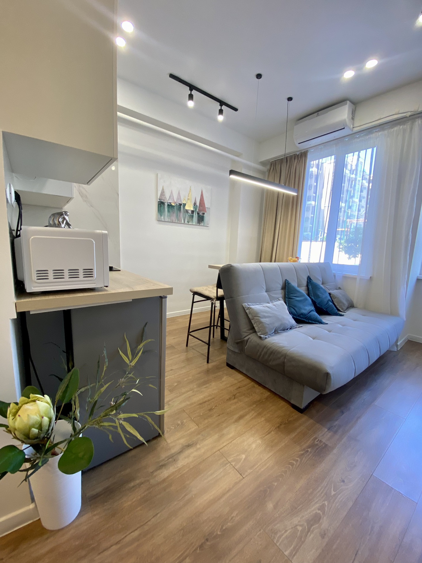 Светлая и комфортная студи оснащена всем необходимым для длительного проживания. До моря 15-20 минут пешком.