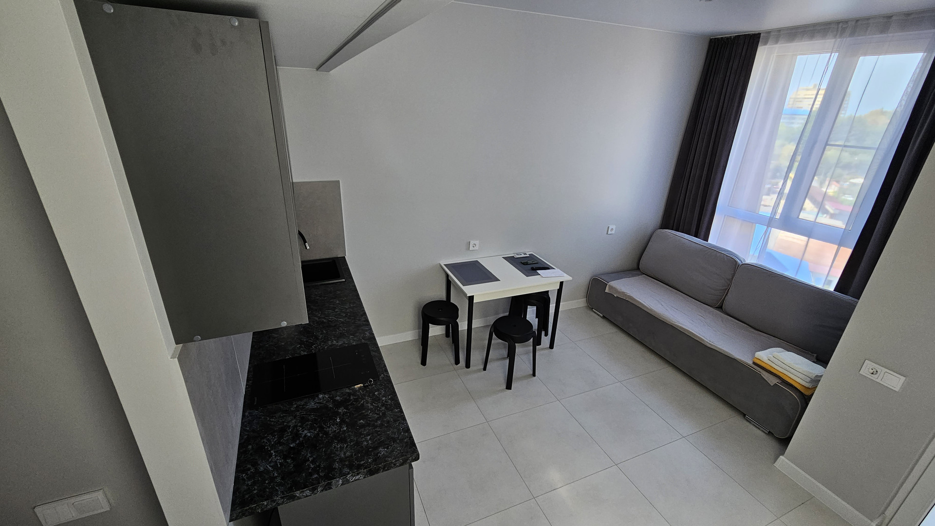 - есть всё необходимое для комфортного отдыха (двуспальная кровать, шкаф, диван-кровать, кухонный уголок, электроплита, холодильник, микроволновая печь, чайник, посуда, стол, стулья, телевизор, совмещенный санузел с душевой зоной, стиральная машинка, утюг, гладильная доска, фен, постельное белье, полотенца, интернет, кабельное телевидение, кондиционер).