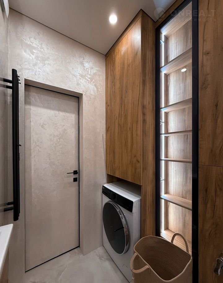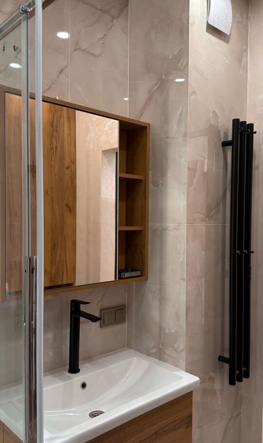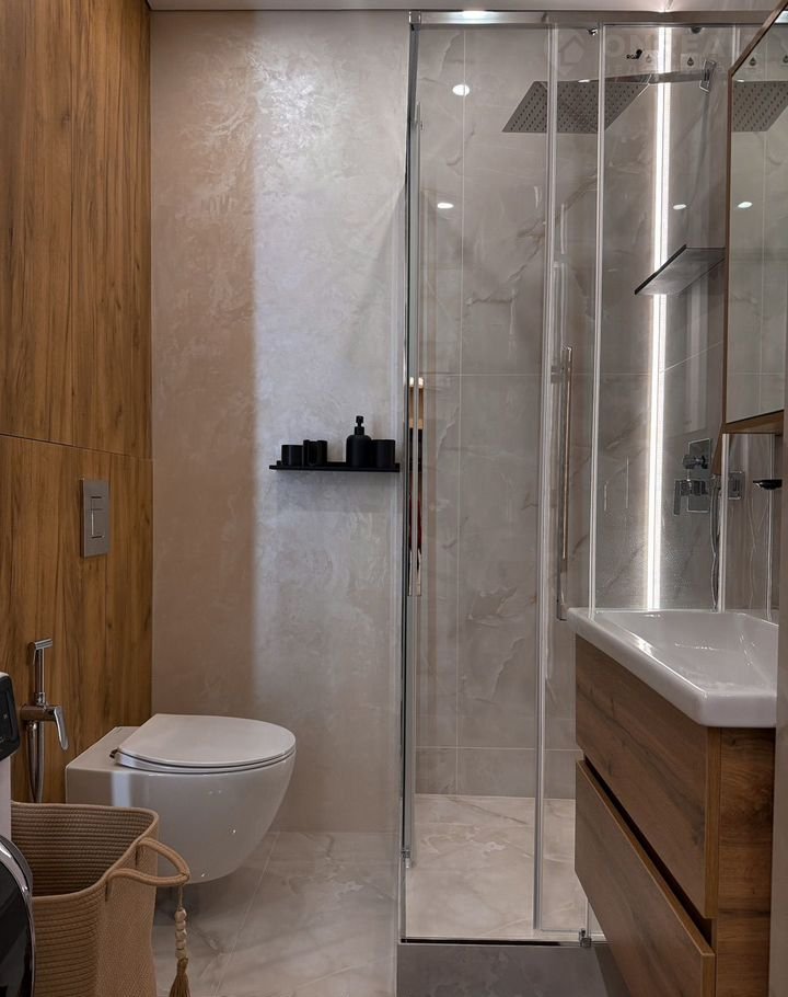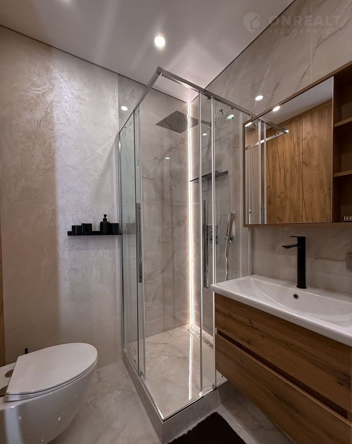 Зеркало с подсветкой, совмещенный санузел с душевой, с мягкой подсветкой, для отдыха глаз после насыщенного дня.