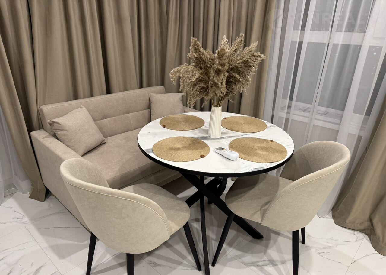 В гостиной установлен диван и обеденная зона с круглым столом и стульями. В спальне большая кровать и вместительные шкафы. Из мебели также имеются встроенные шкафы в коридоре.