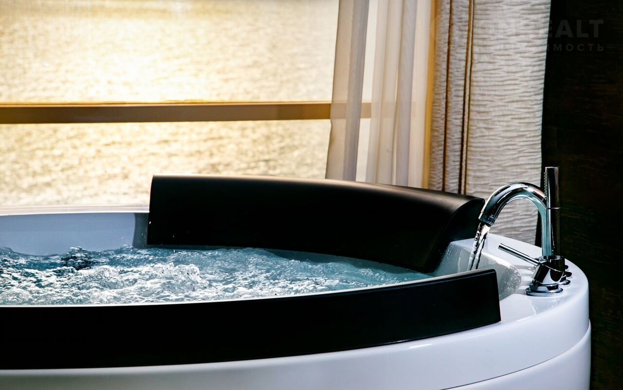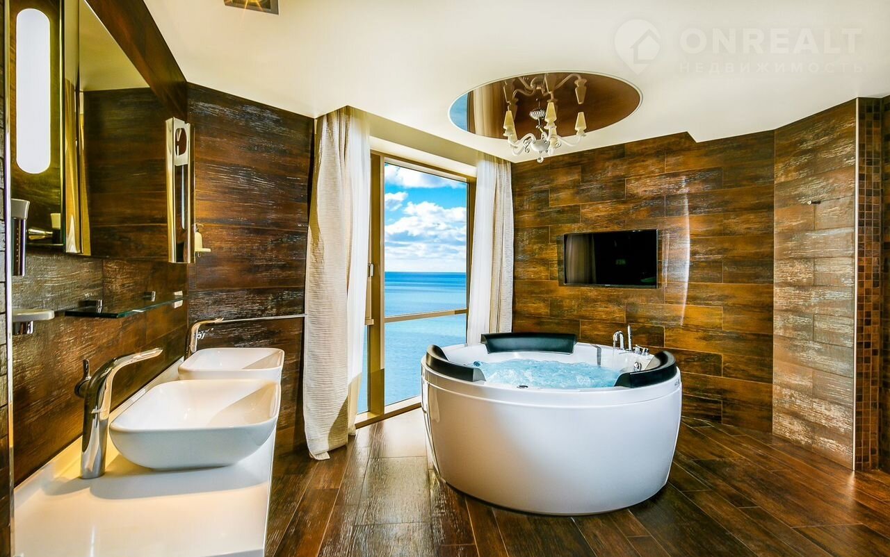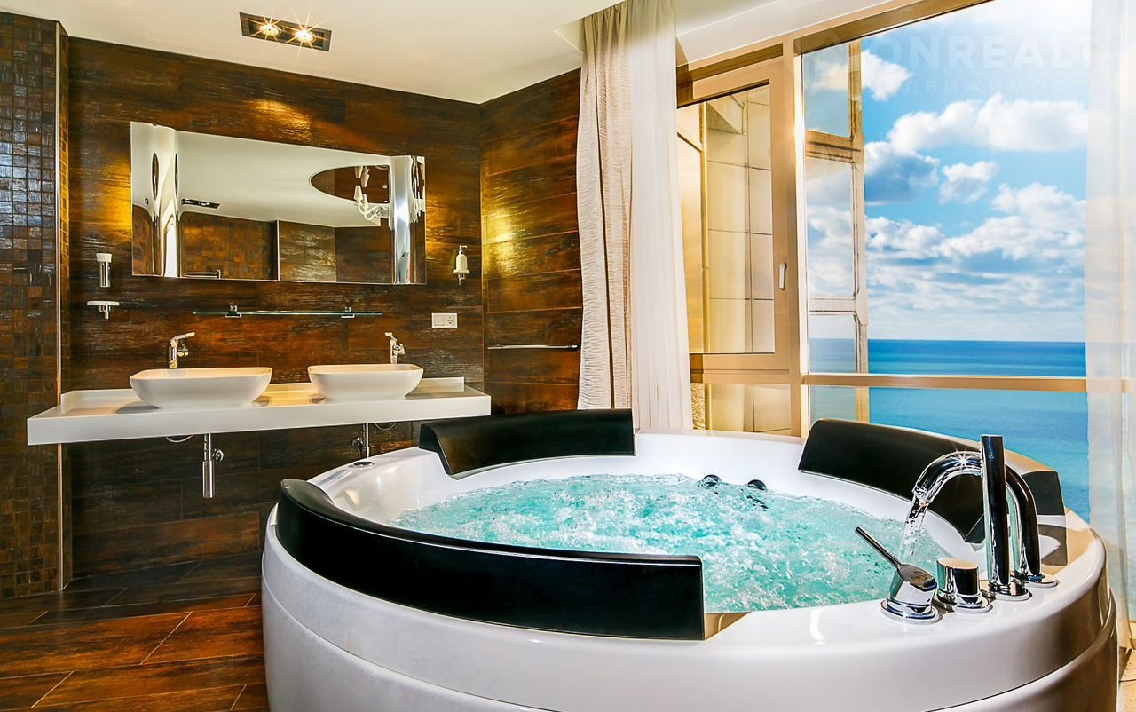 Изюминка квартиры - эксклюзивная ванная комната-будуар с панорамным видом на море.