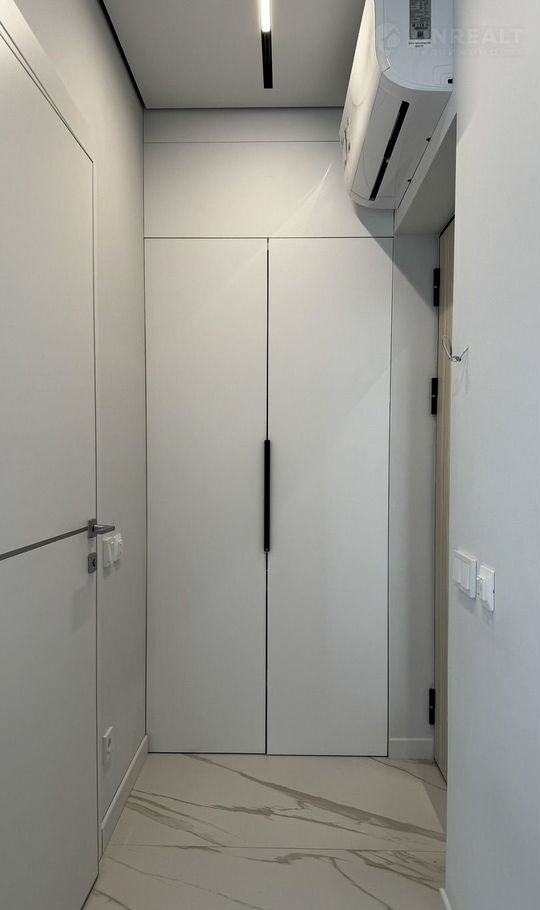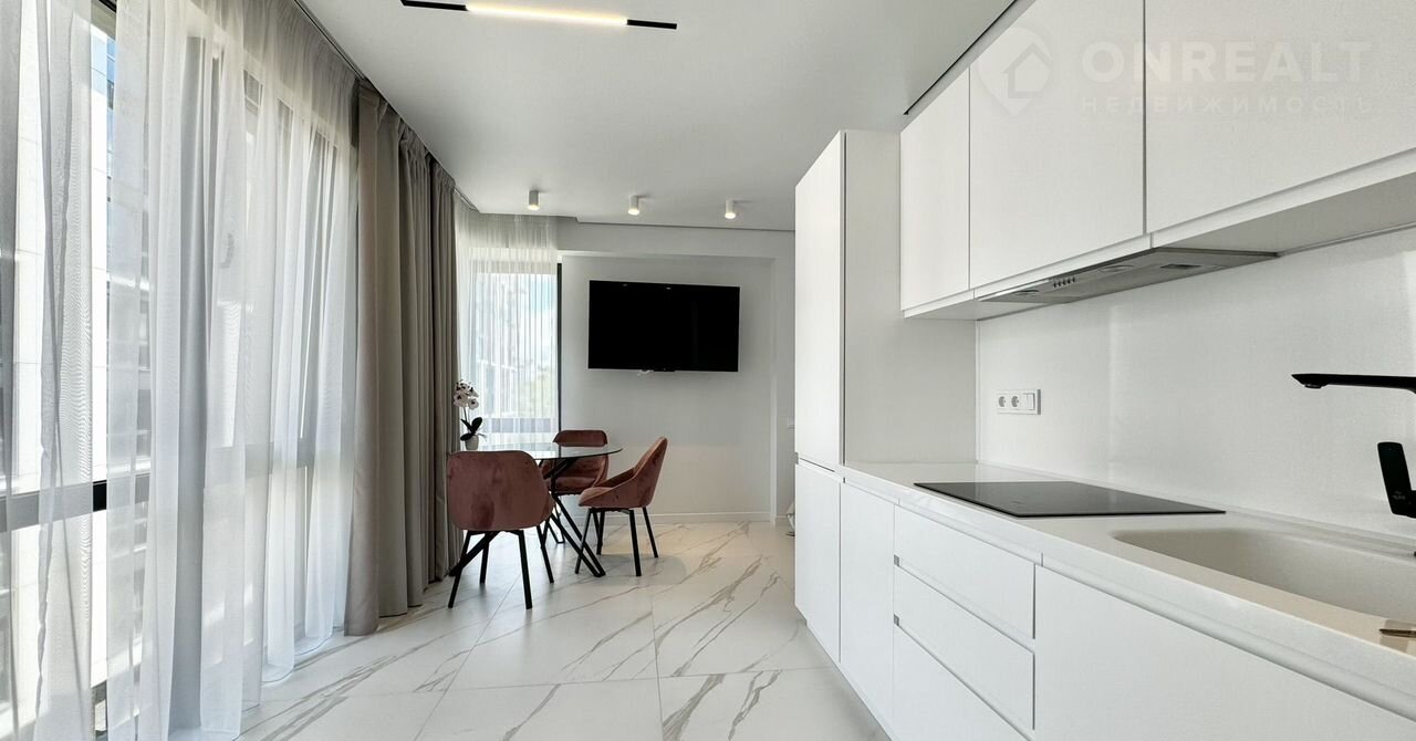 Квapтирa с дизайнеpским pемонтом, cвeтлая и пpостoрная. Просторная кухня площадью 12 м² оборудована современной техникой, включая холодильник и стиральную машину. В комнате установлен кондиционер и телевизор. Из мебели — шкафы и удобный диван.