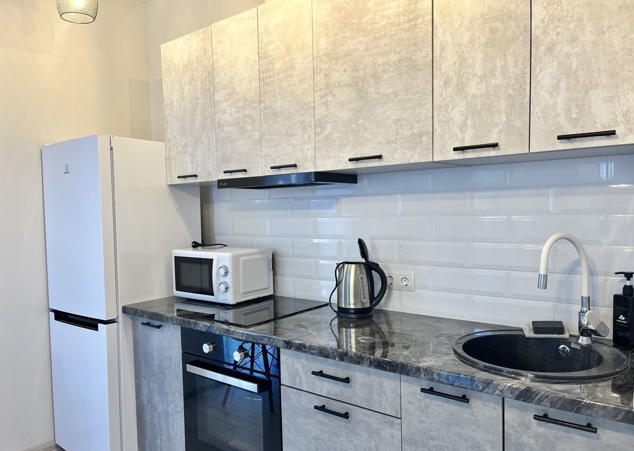 В полностью укомплектованной кухне: холодильник, микроволновка, индукционная плита, чайник, необходимая посуда, столовые приборы и принадлежности
