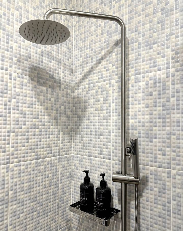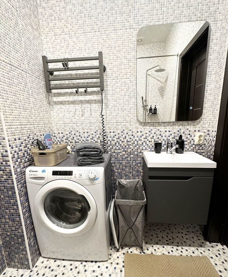 • Ванная комната: душевая, унитаз, раковина, стиральная машина, корзина для белья, сушилка для белья.