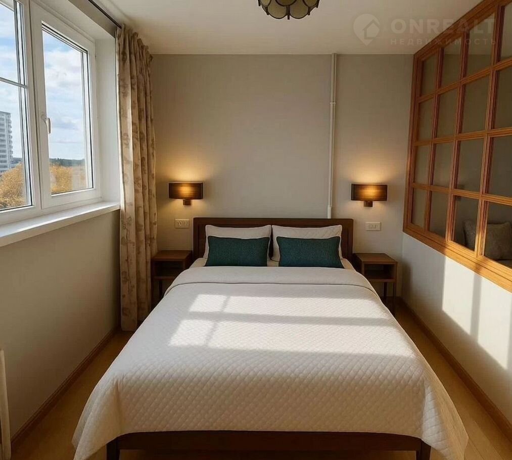 Комната разделена перегородкой ,со шторой блэк - аут .В спальню есть выход с кухни ,закрывается дверью .