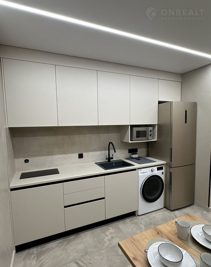 Кухня оборудована встраиваемой техникой, и посудой, гель для мытья посуды, губка/тряпка, полотенце)