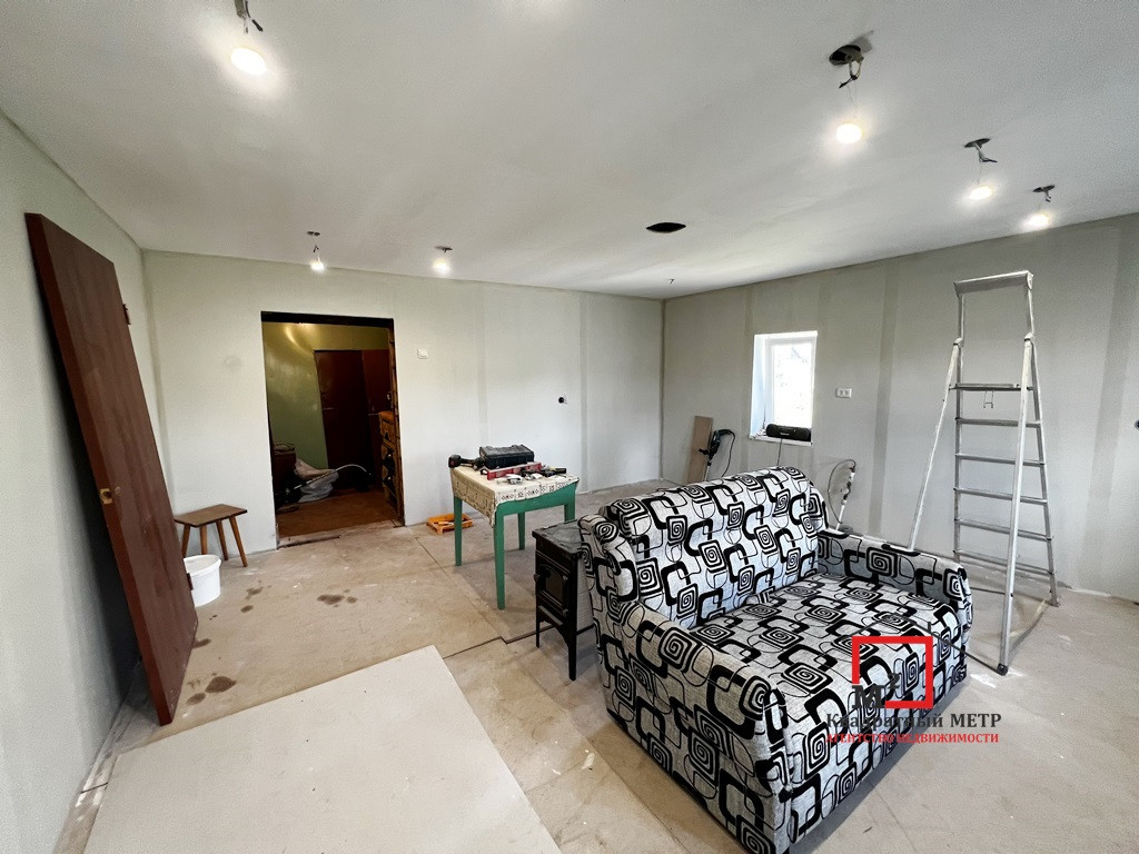 Жилой дом на ленточном фундаменте. Крыша покрыта шифером. Частичное благоустройство: газ-баллоны, печь разобрана, центральное водоснабжение, канализация септик, заменена электропроводка.