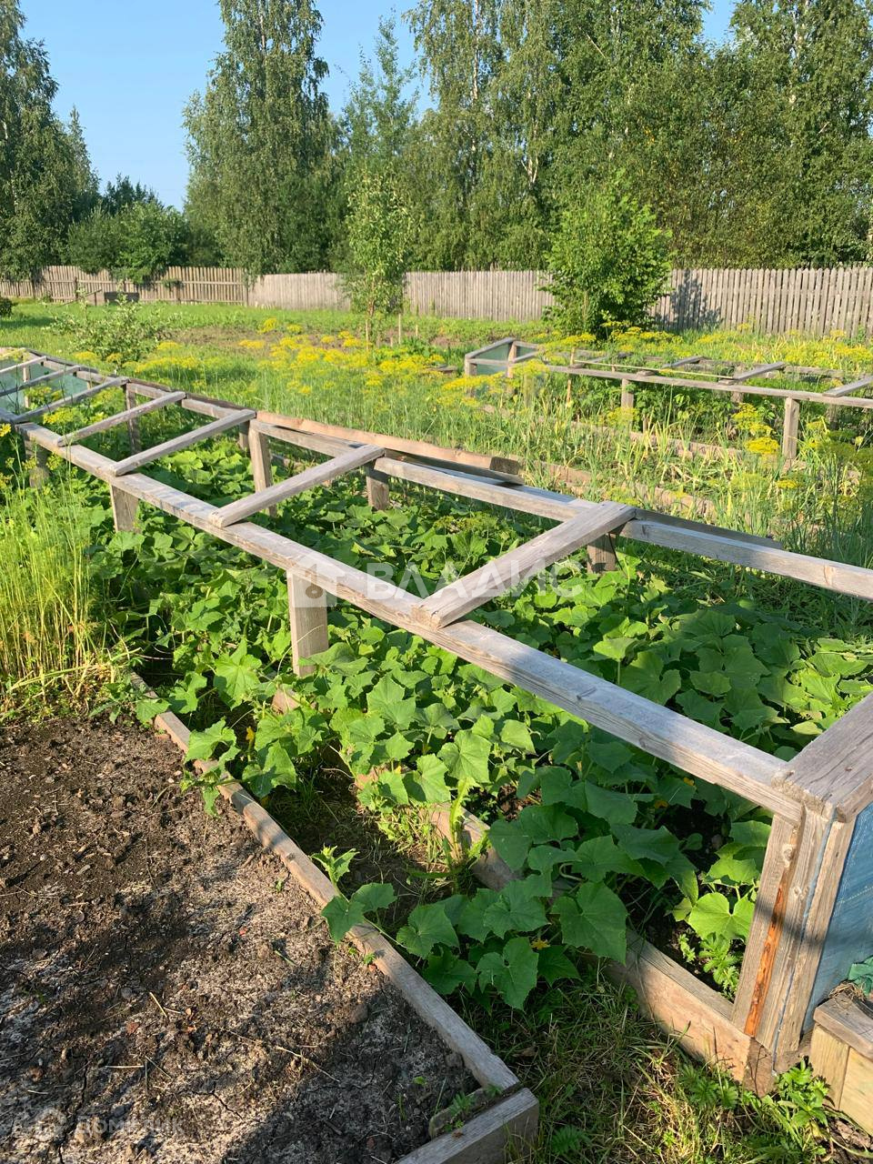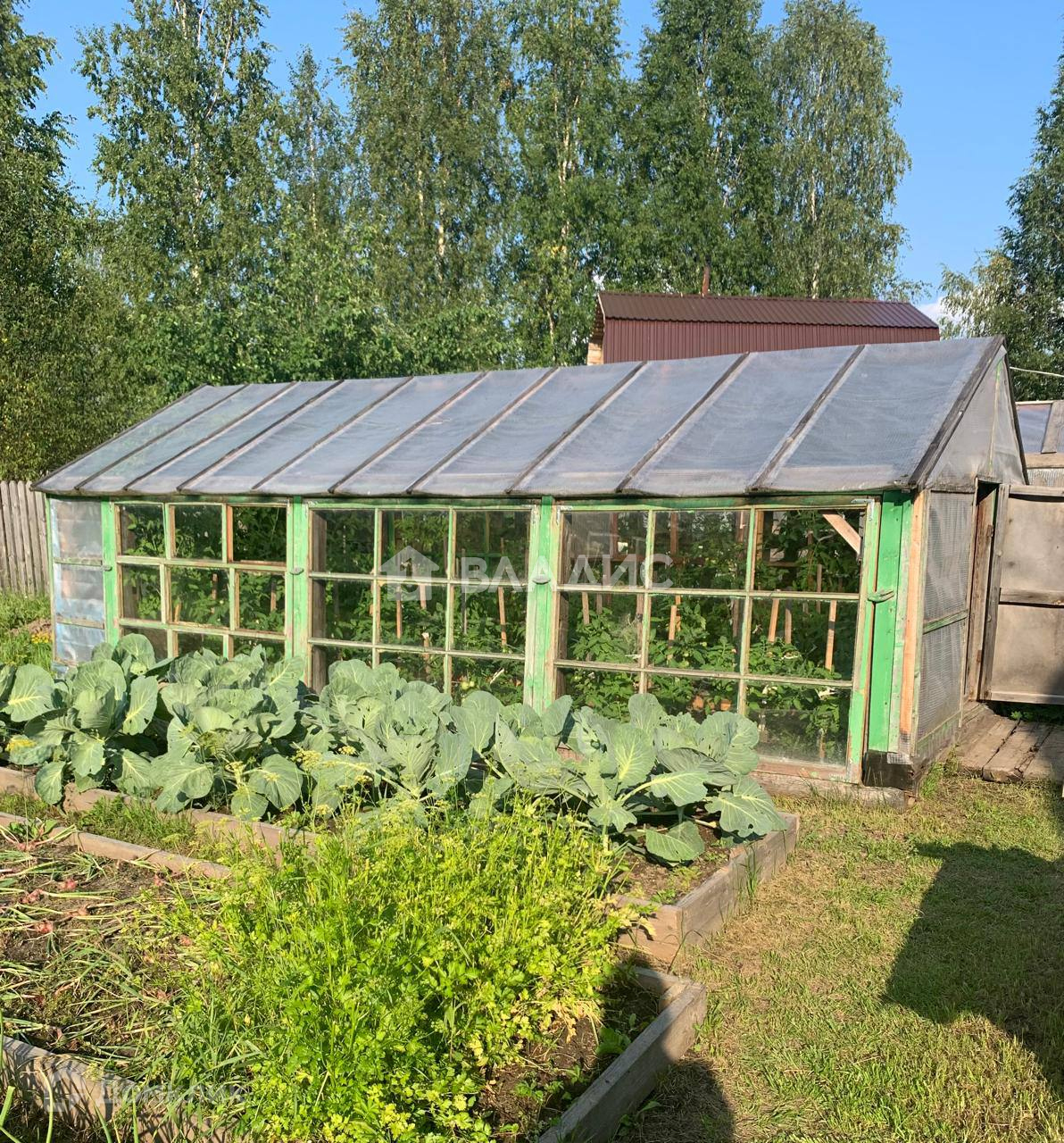 В огороде сделана теплица, парники и летний душ.