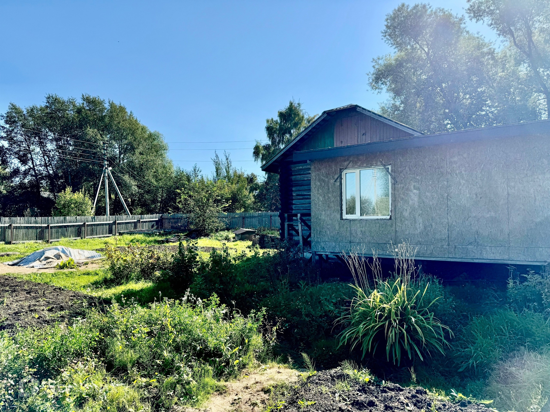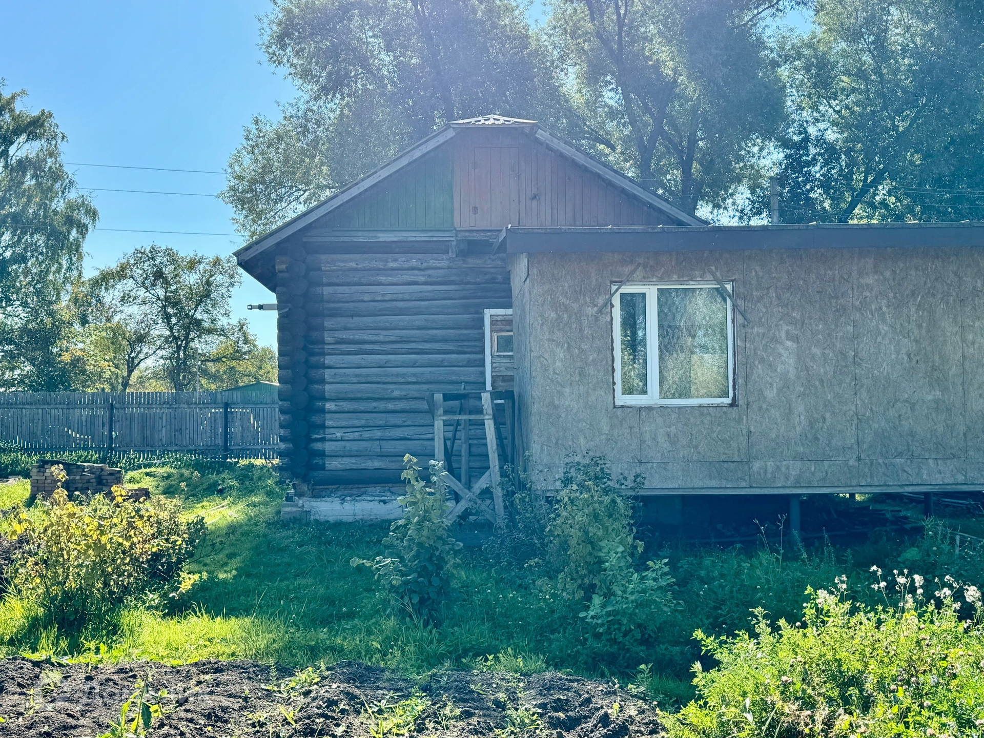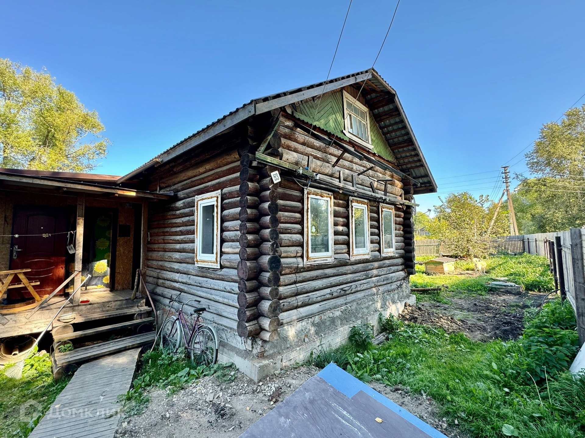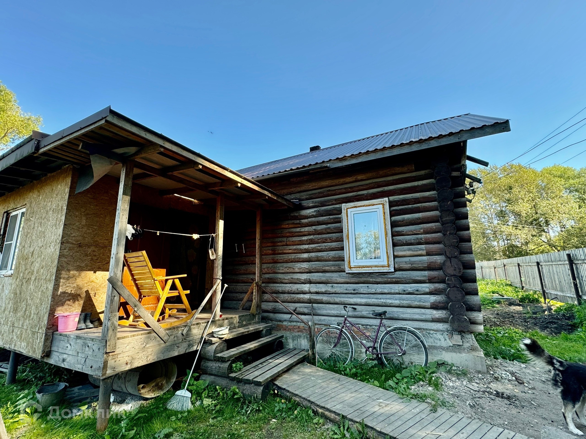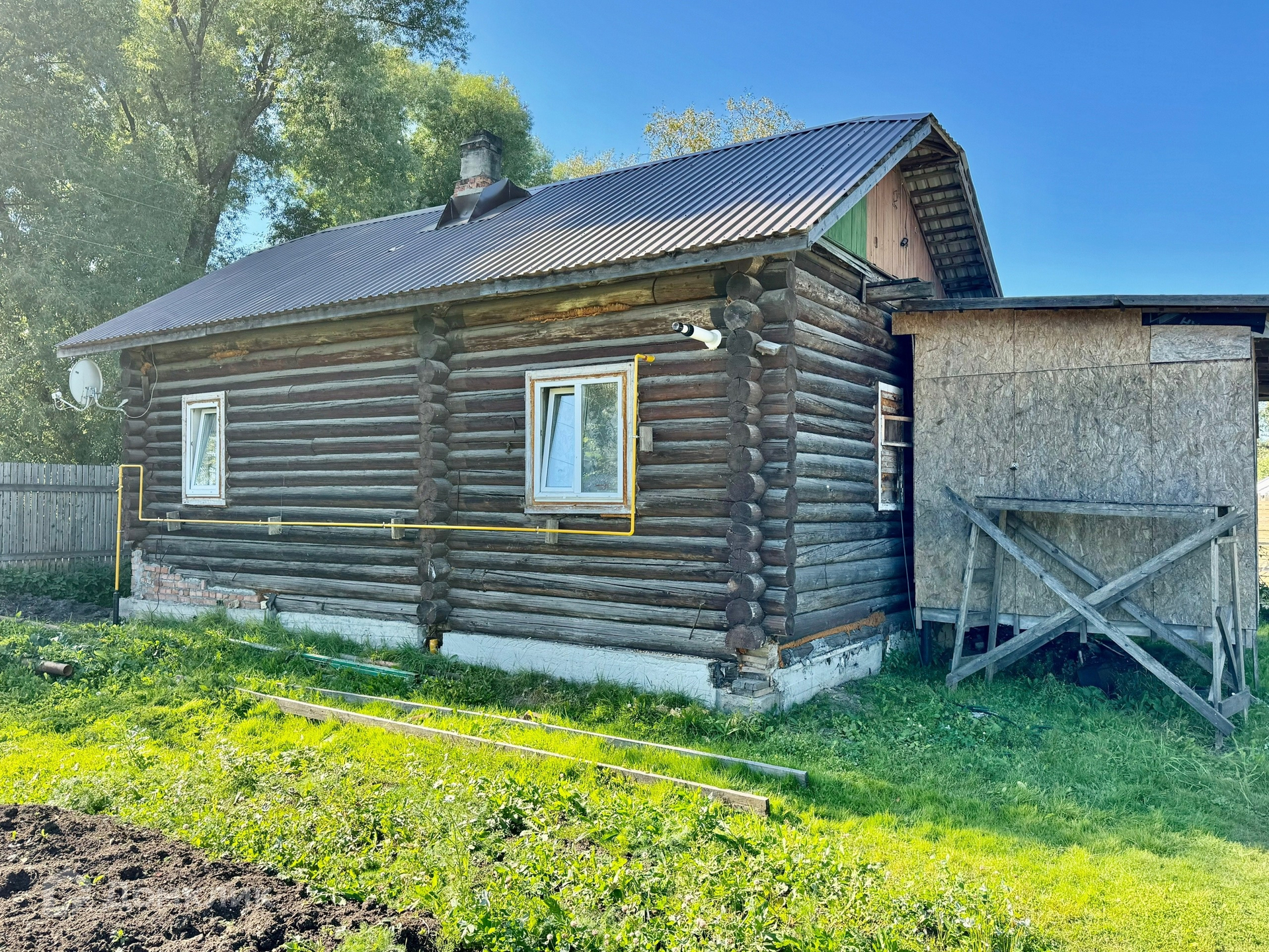Одноэтажный бревенчатый дом на ленточном фундаменте, пристройка на сваях утеплена, крыша металлопрофиль, S участка-12 соток, S дома-43,8 м2 без учета пристройки.