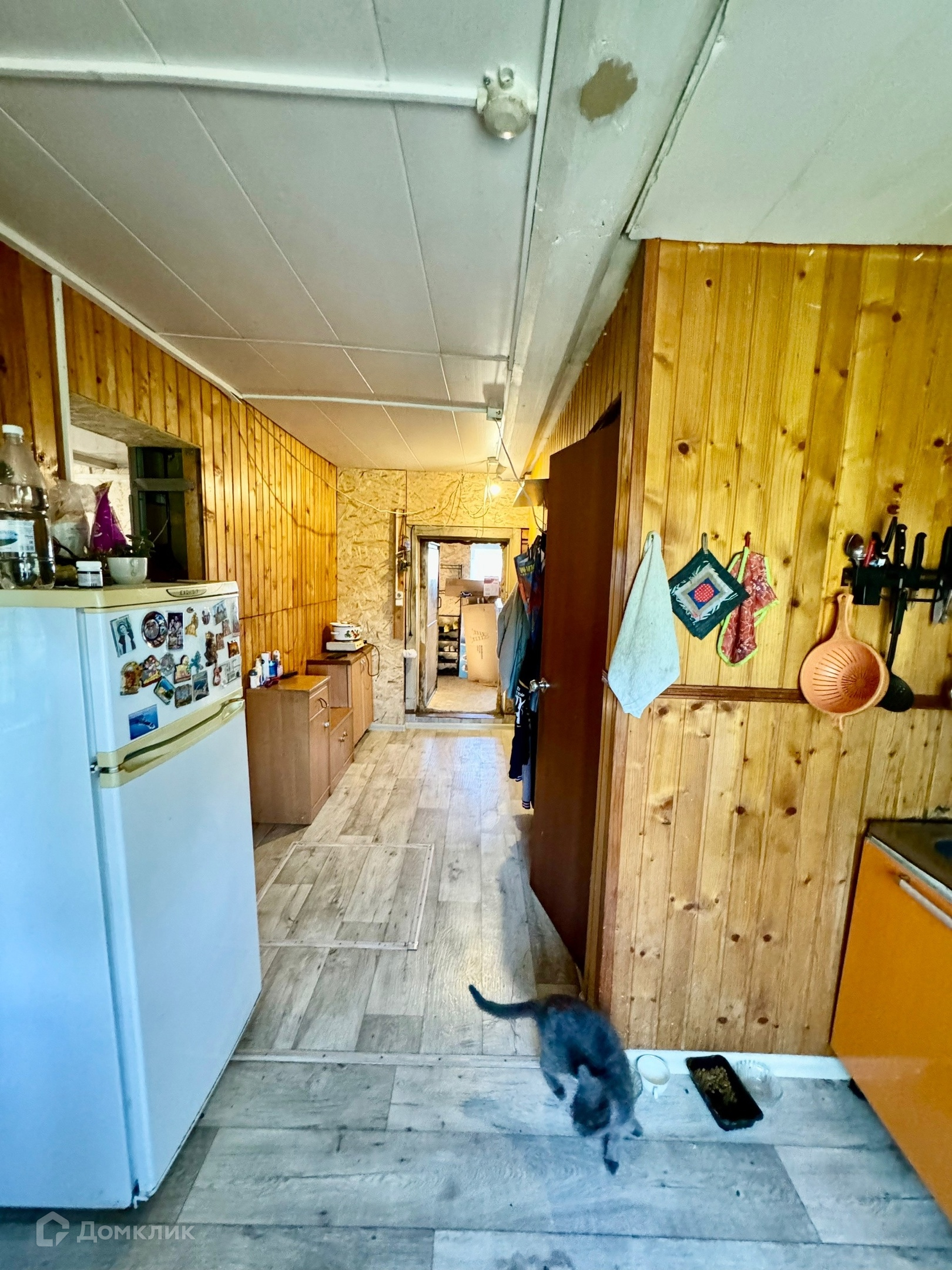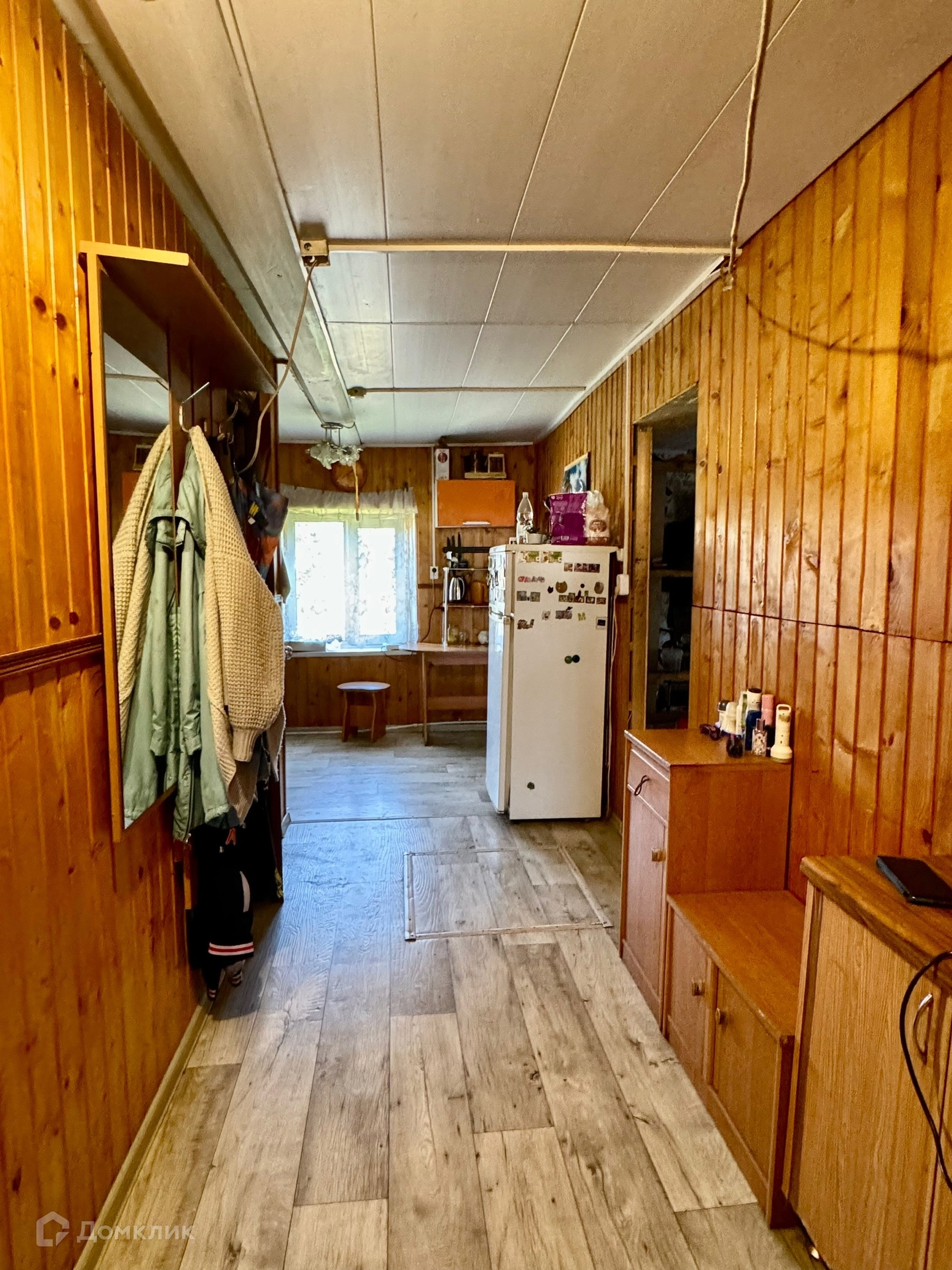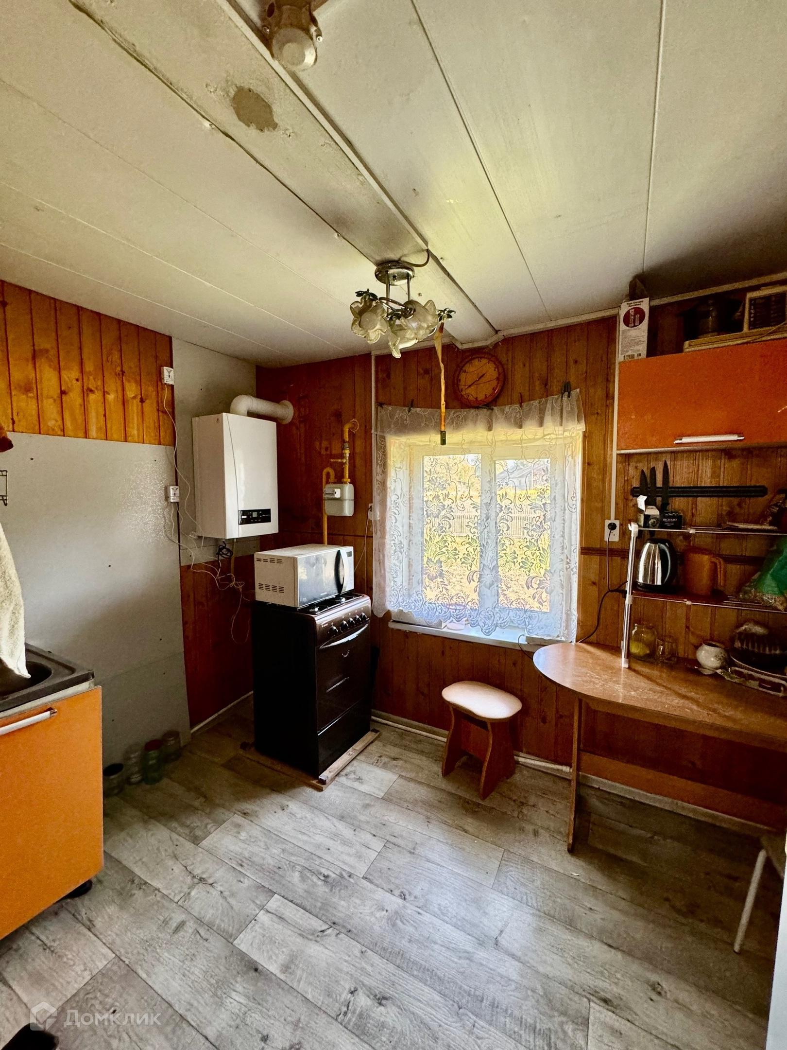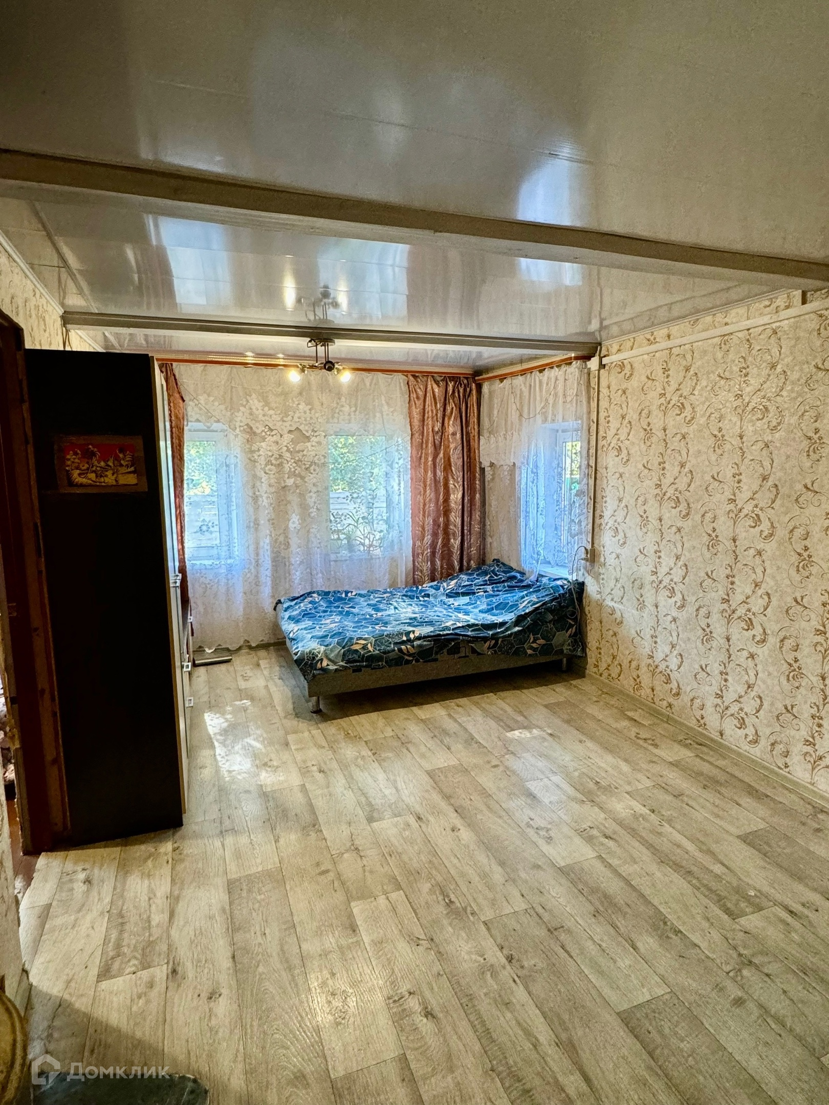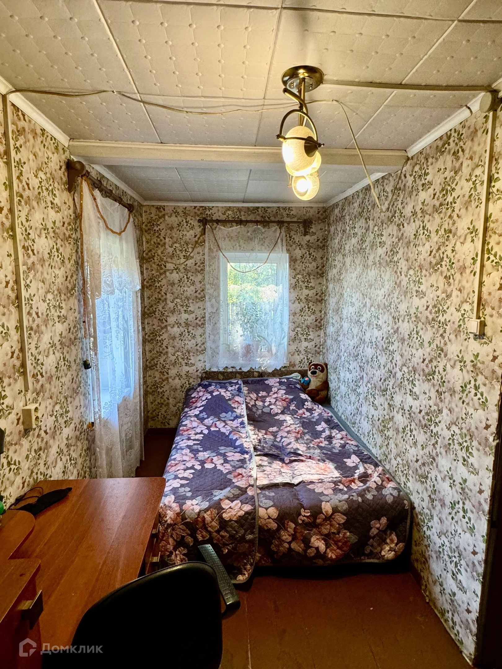 Одноэтажный бревенчатый дом на ленточном фундаменте, пристройка на сваях утеплена, крыша металлопрофиль, S участка-12 соток, S дома-43,8 м2 без учета пристройки.