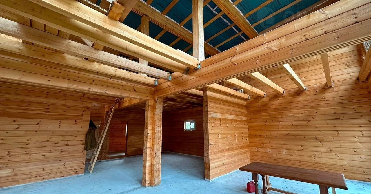 - Сруб из клеенного бруса в два этажа, современный стиль, крыша утепление 250
