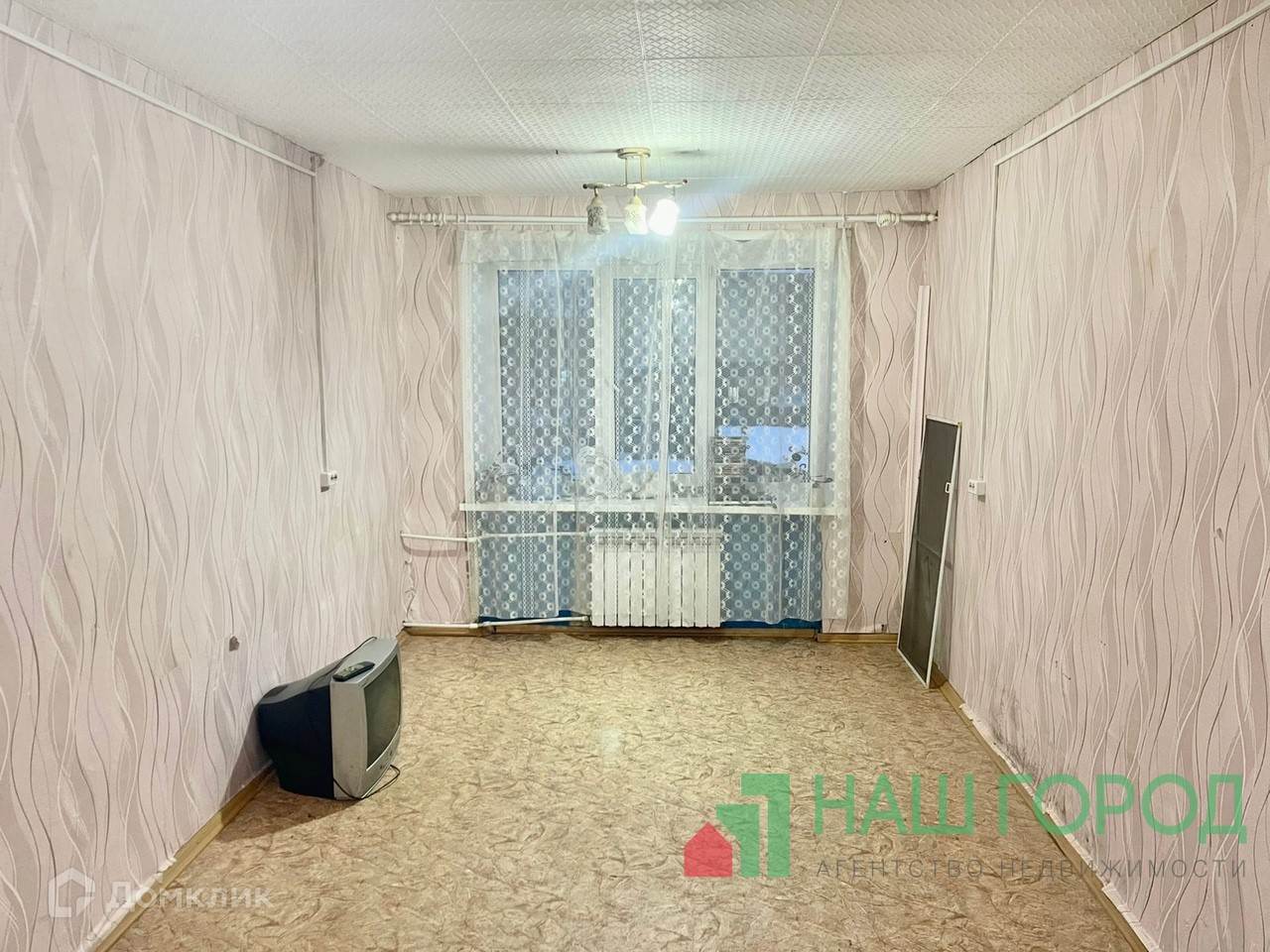 -Окно пластиковое, потолок оклеен потолочной плиткой, напольное покрытие линолеум, хорошая входная дверь.