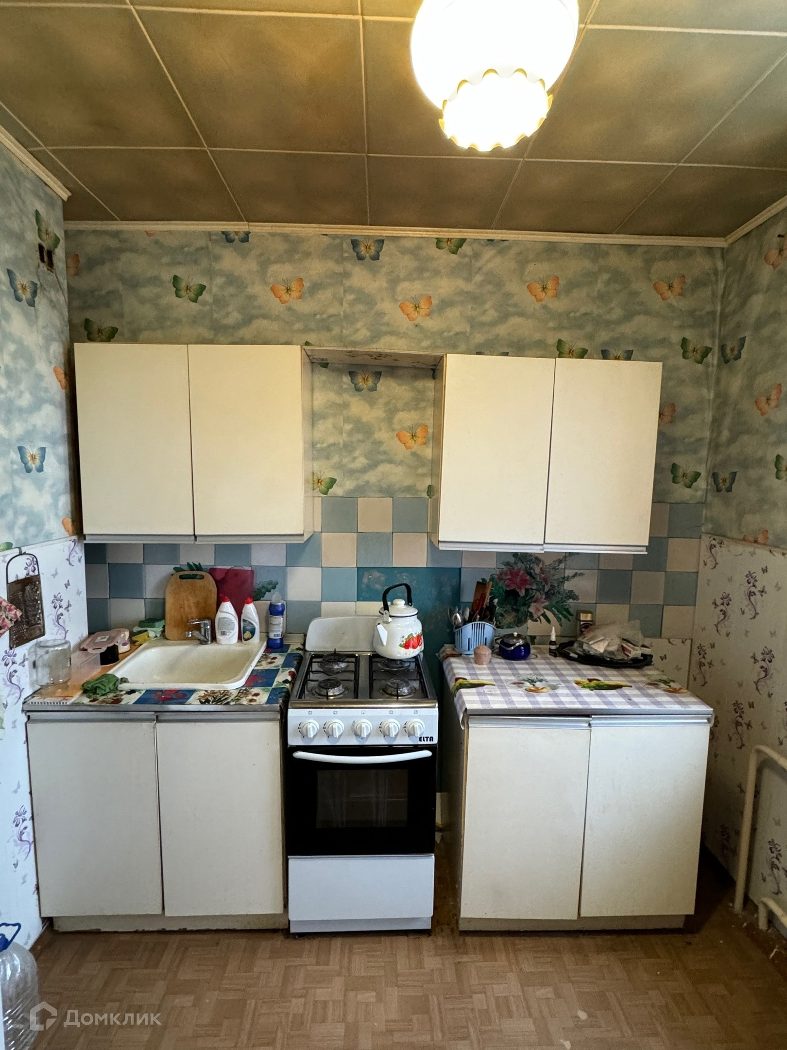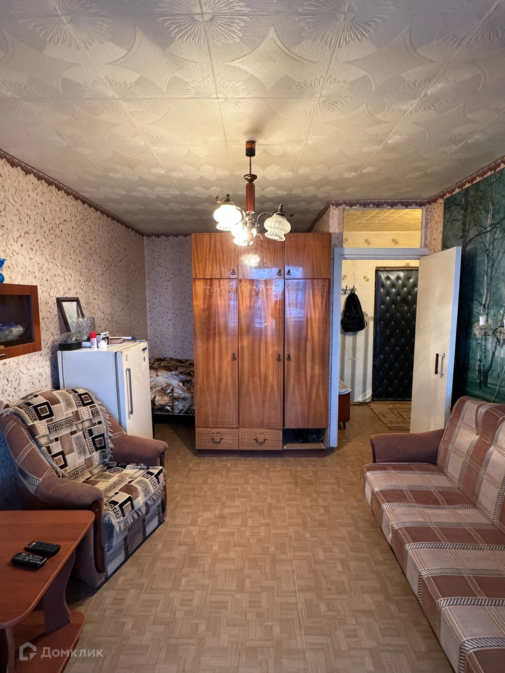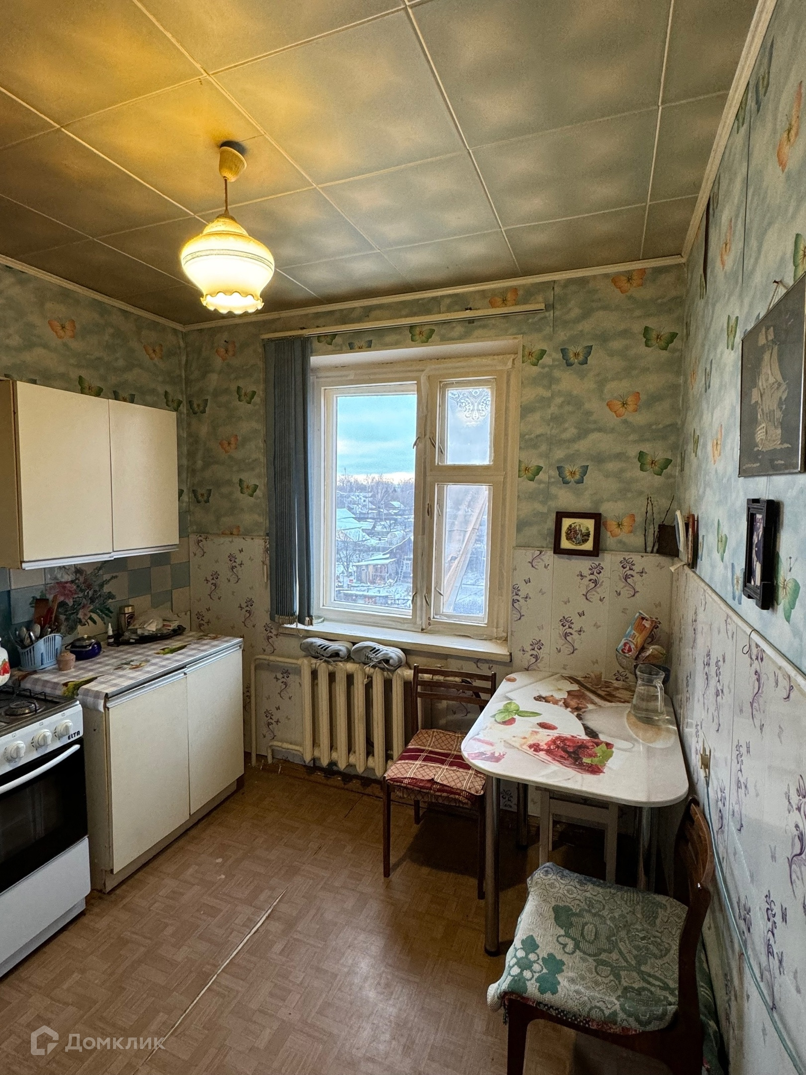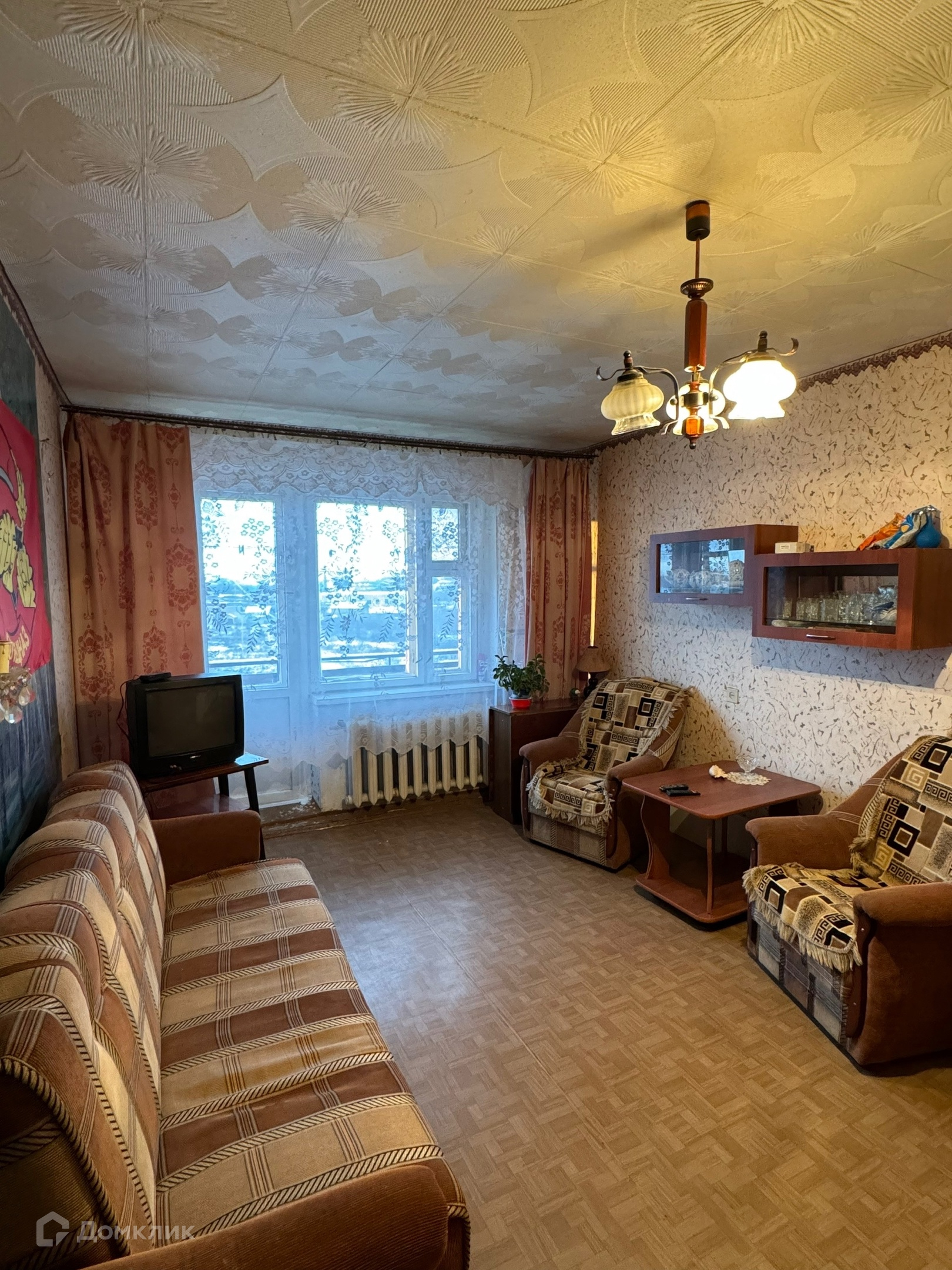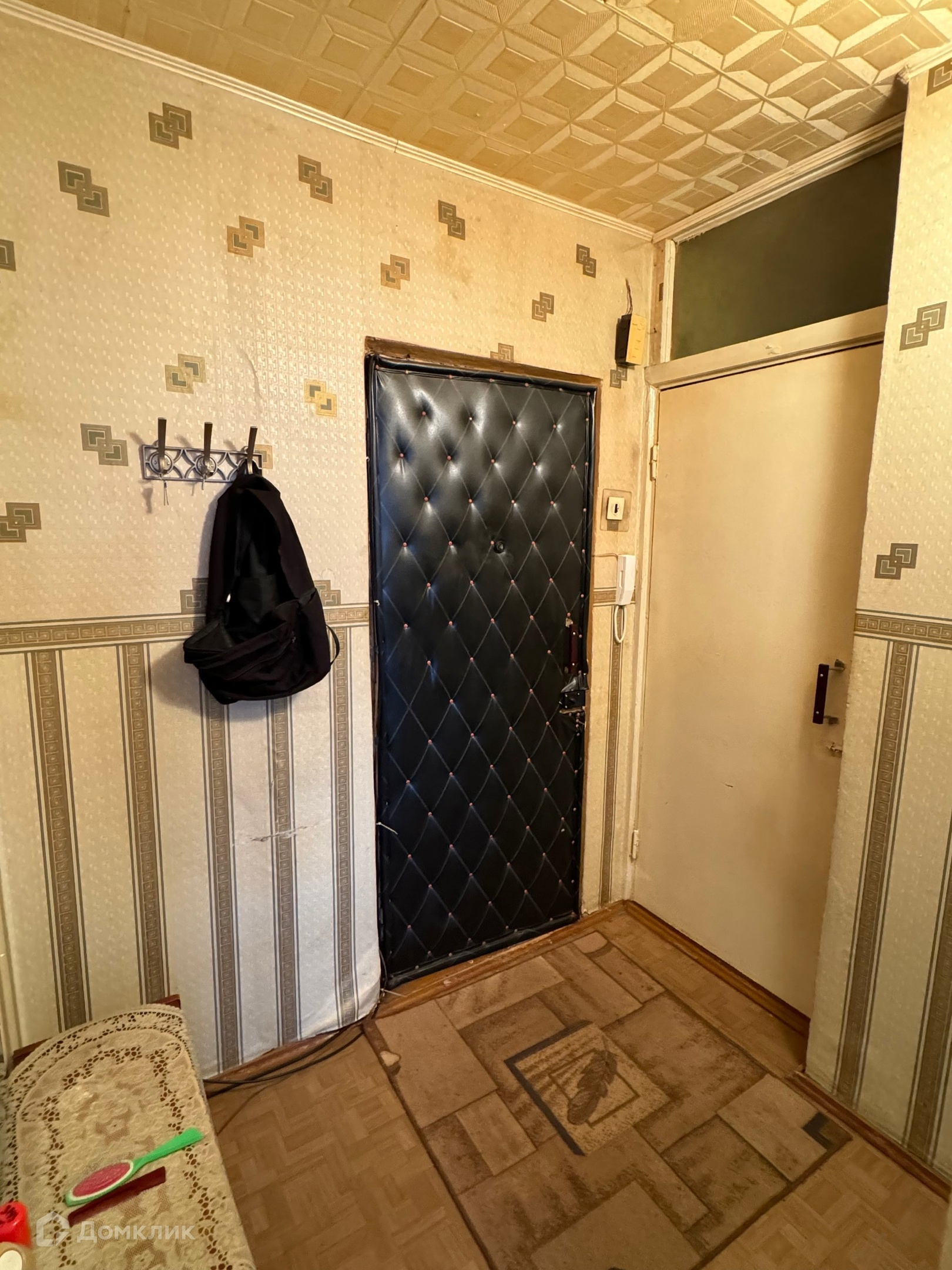-Окна все хорошие деревянные, балкон не застеклен, потолки оклеены потолочной плиткой, напольное покрытие линолеум, межкомнатные и входная двери деревянные. Так же есть вместительная гардеробная в прихожей.