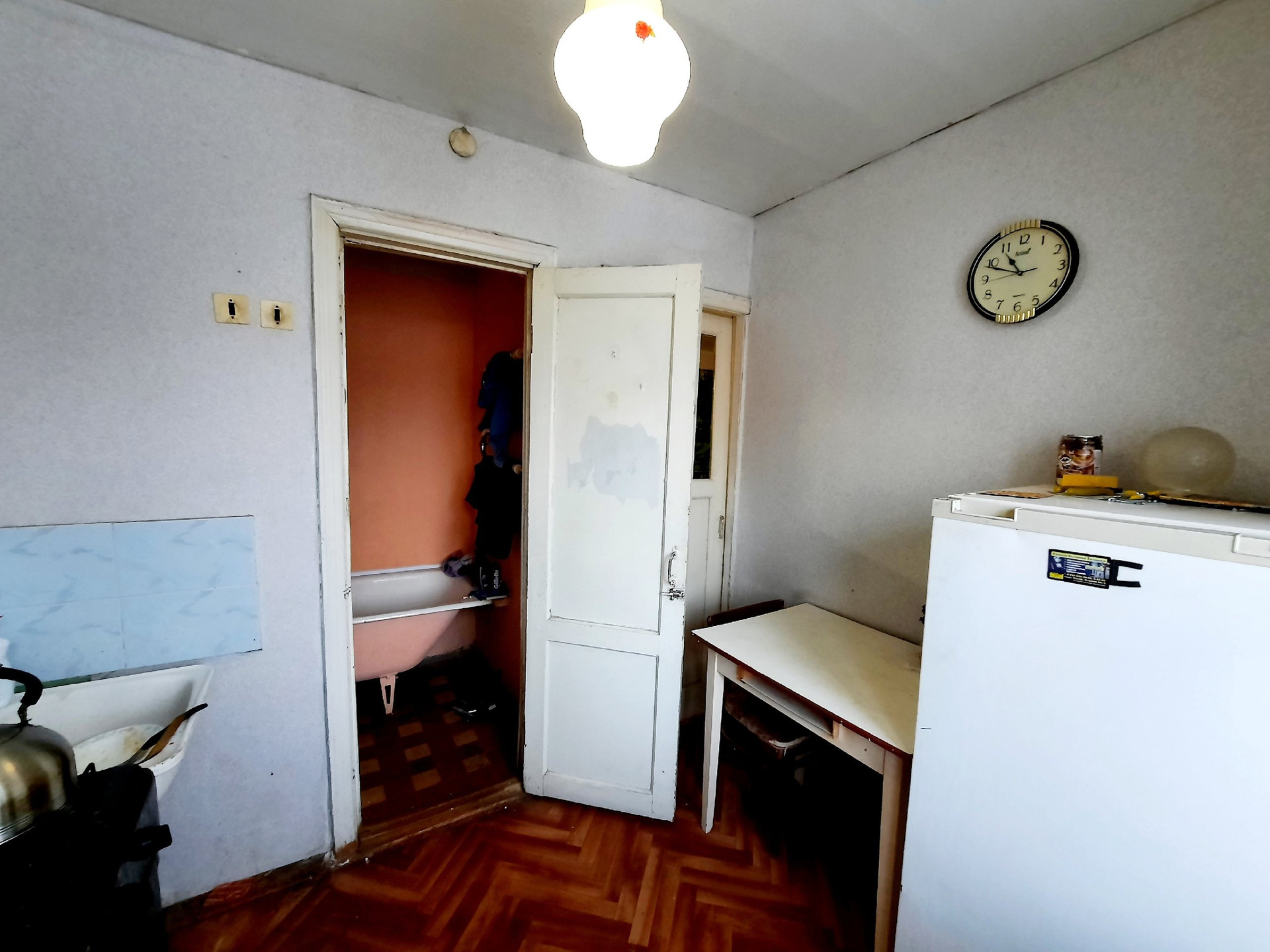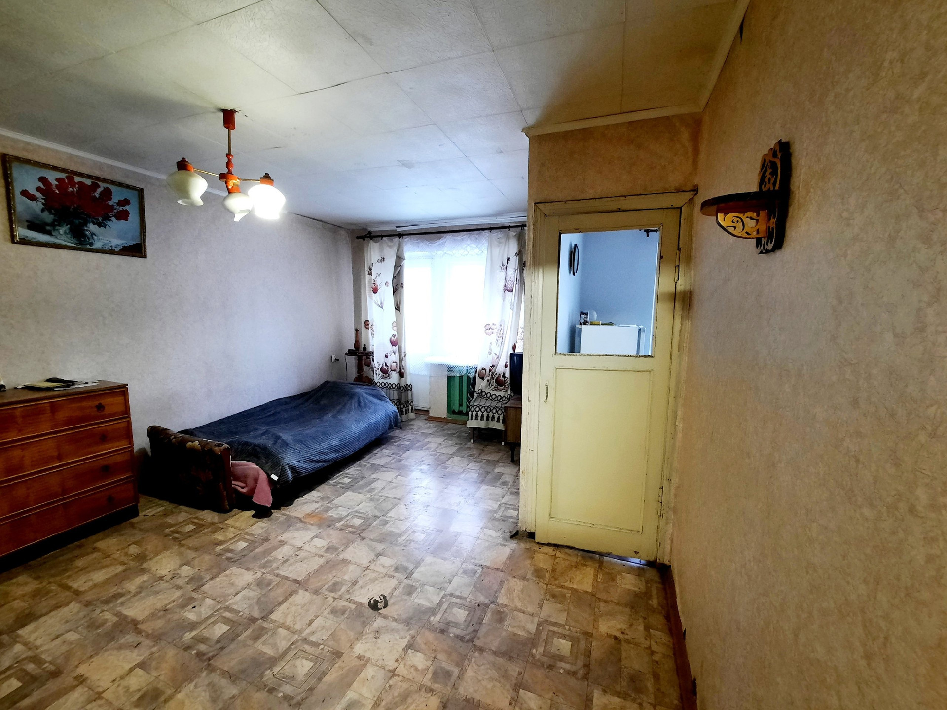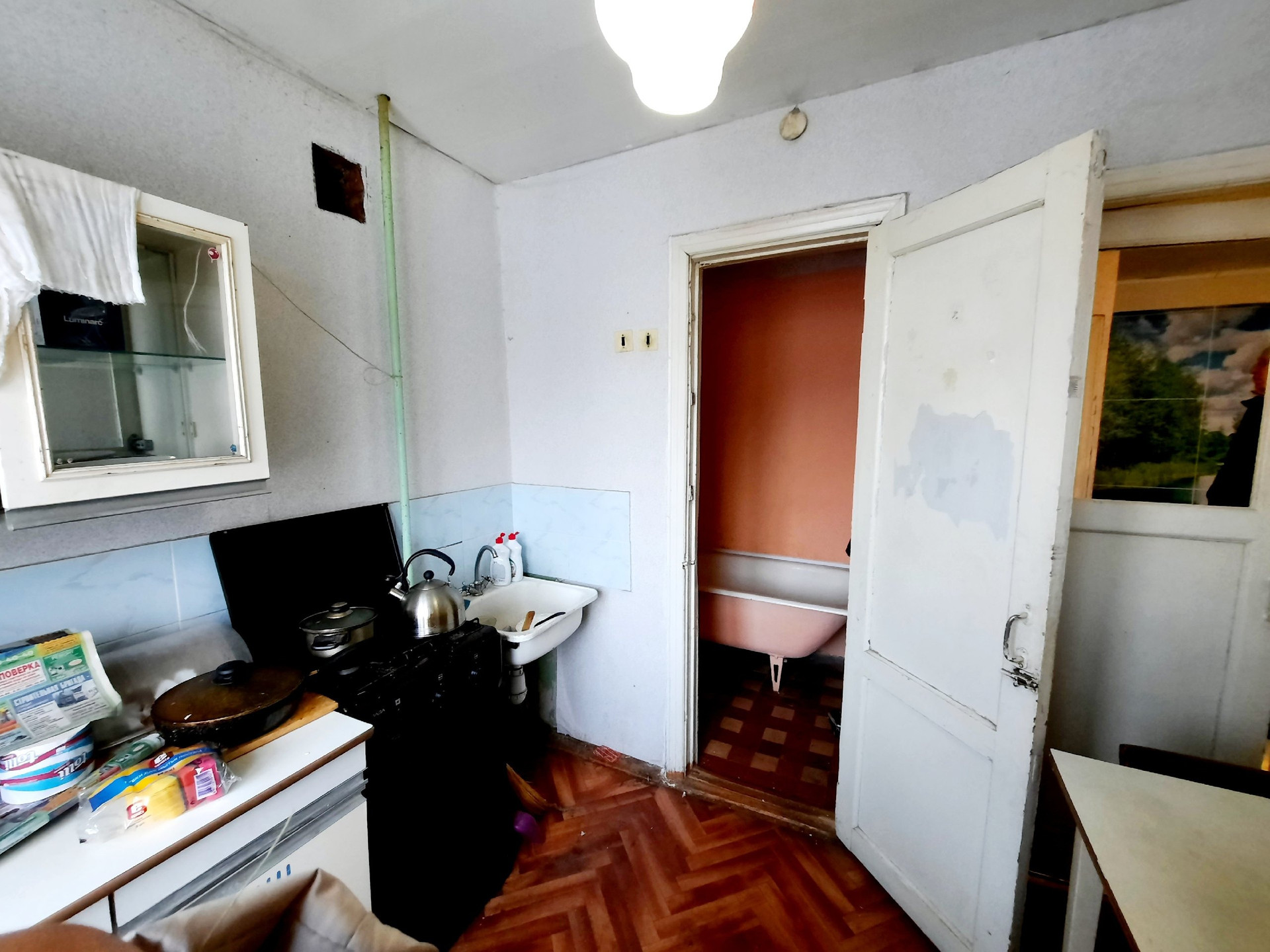 Квартира не угловая. Балкон не застеклен.Сан.узел раздельный, дверь в ванную из кухни. Счетчики воды установлены. Квартира требует ремонта.