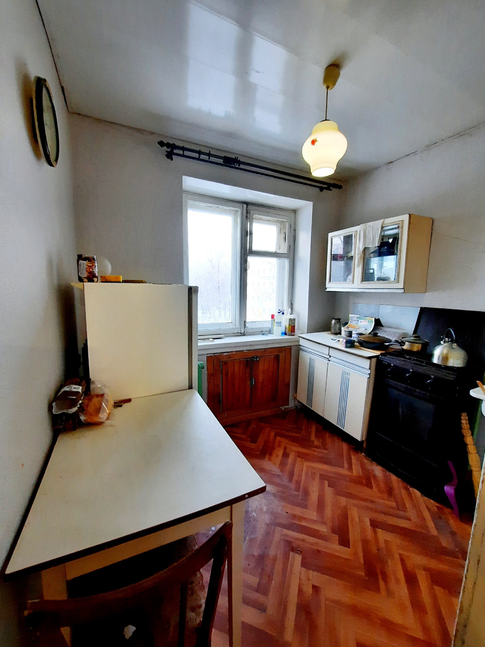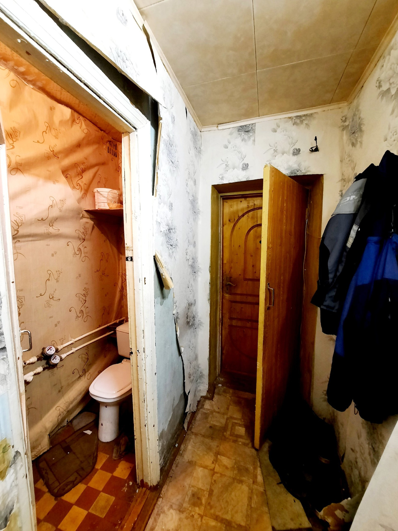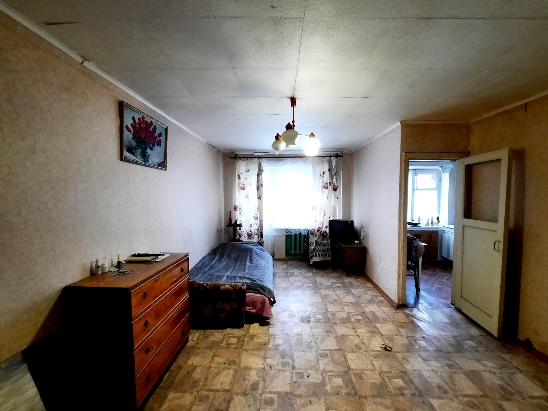 Квартира не угловая. Балкон не застеклен.Сан.узел раздельный, дверь в ванную из кухни. Счетчики воды установлены. Квартира требует ремонта.