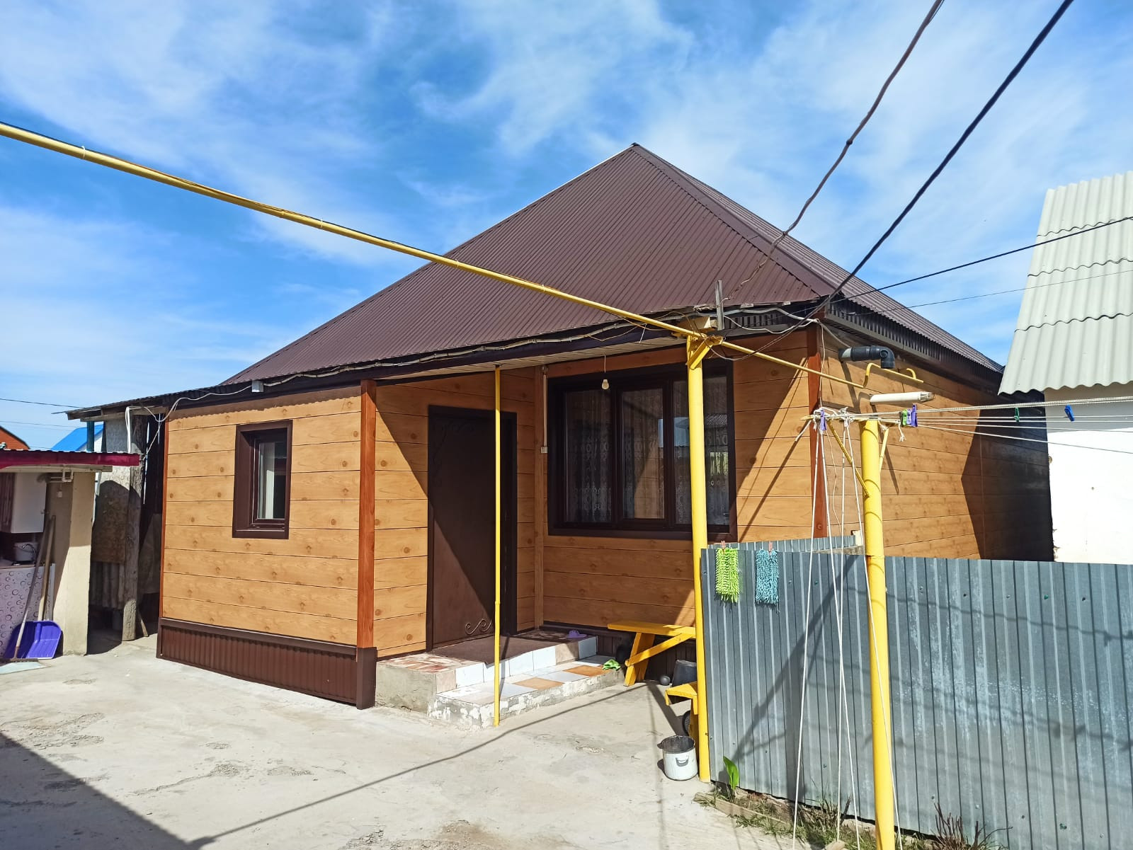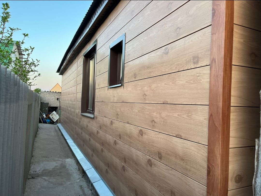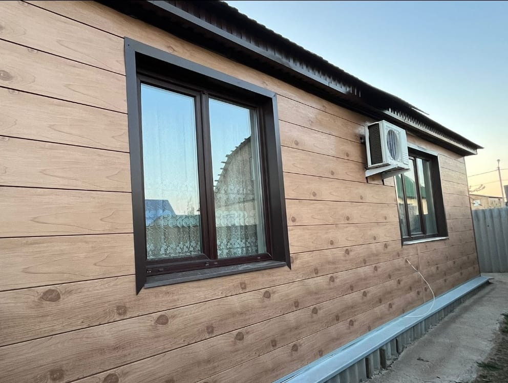 Весь дом построен из бруса, фасад обшит метлосайдингом высокого качества (фактура дерево).