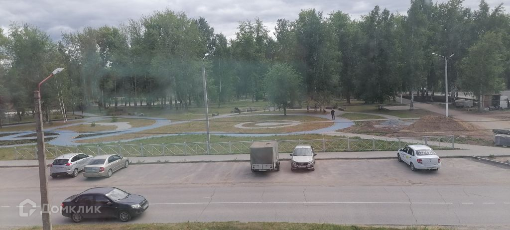 Красивый вид из окон на зону отдыха в городском парке, прогулочные дорожки, клумбы.