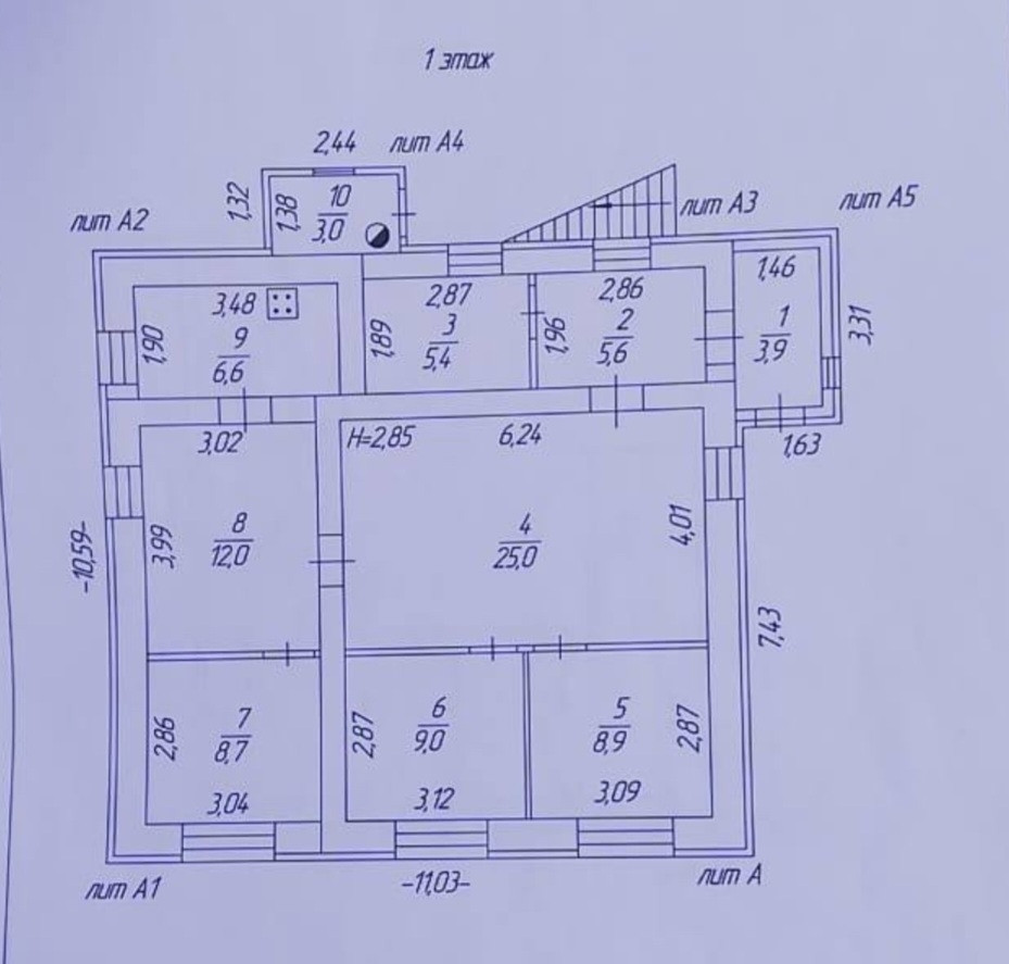 На первом этаже гостиная 25 кв м, 3 комнаты по 9, 12 кв м столовая и 6.6 кухня, сан узел.