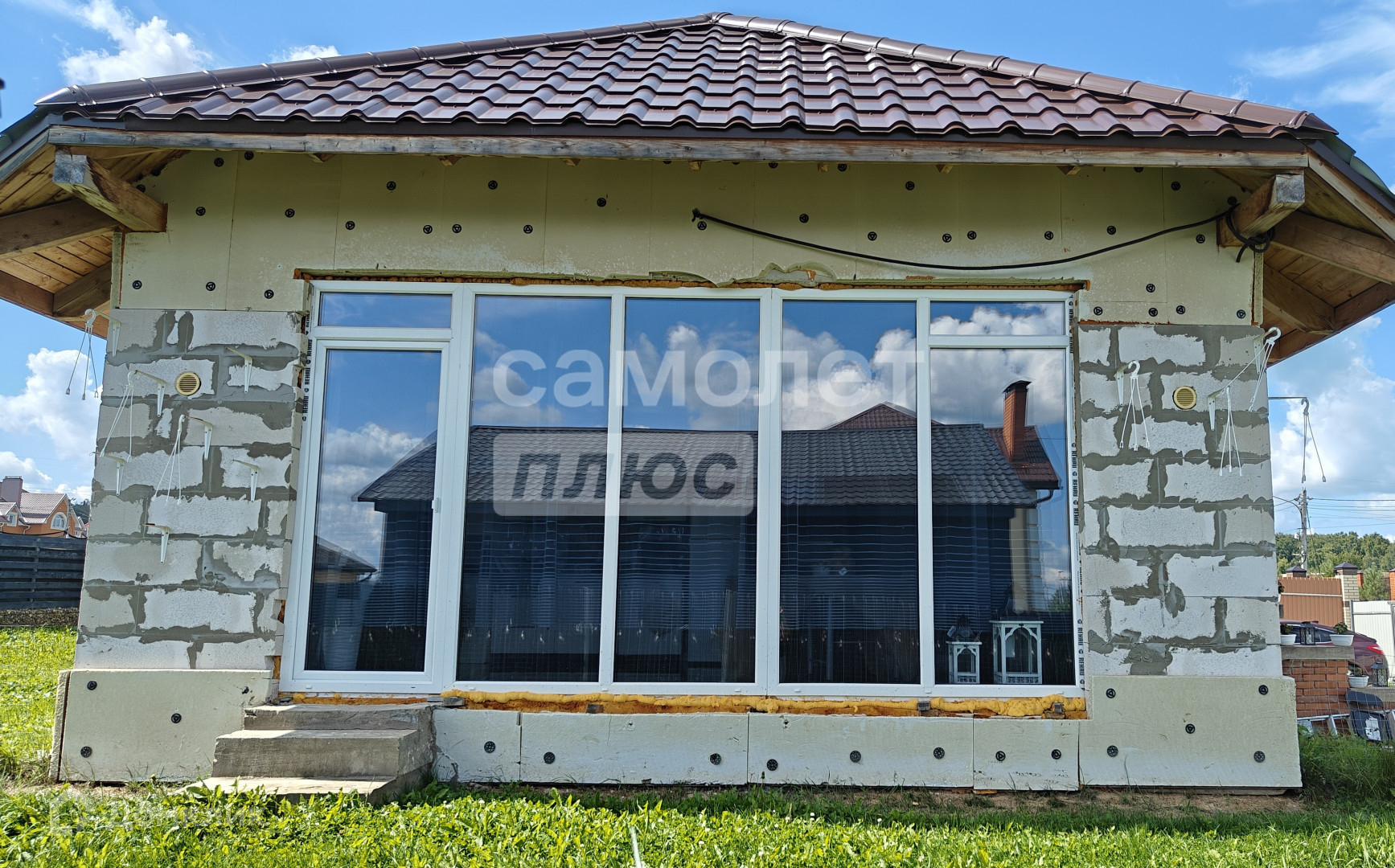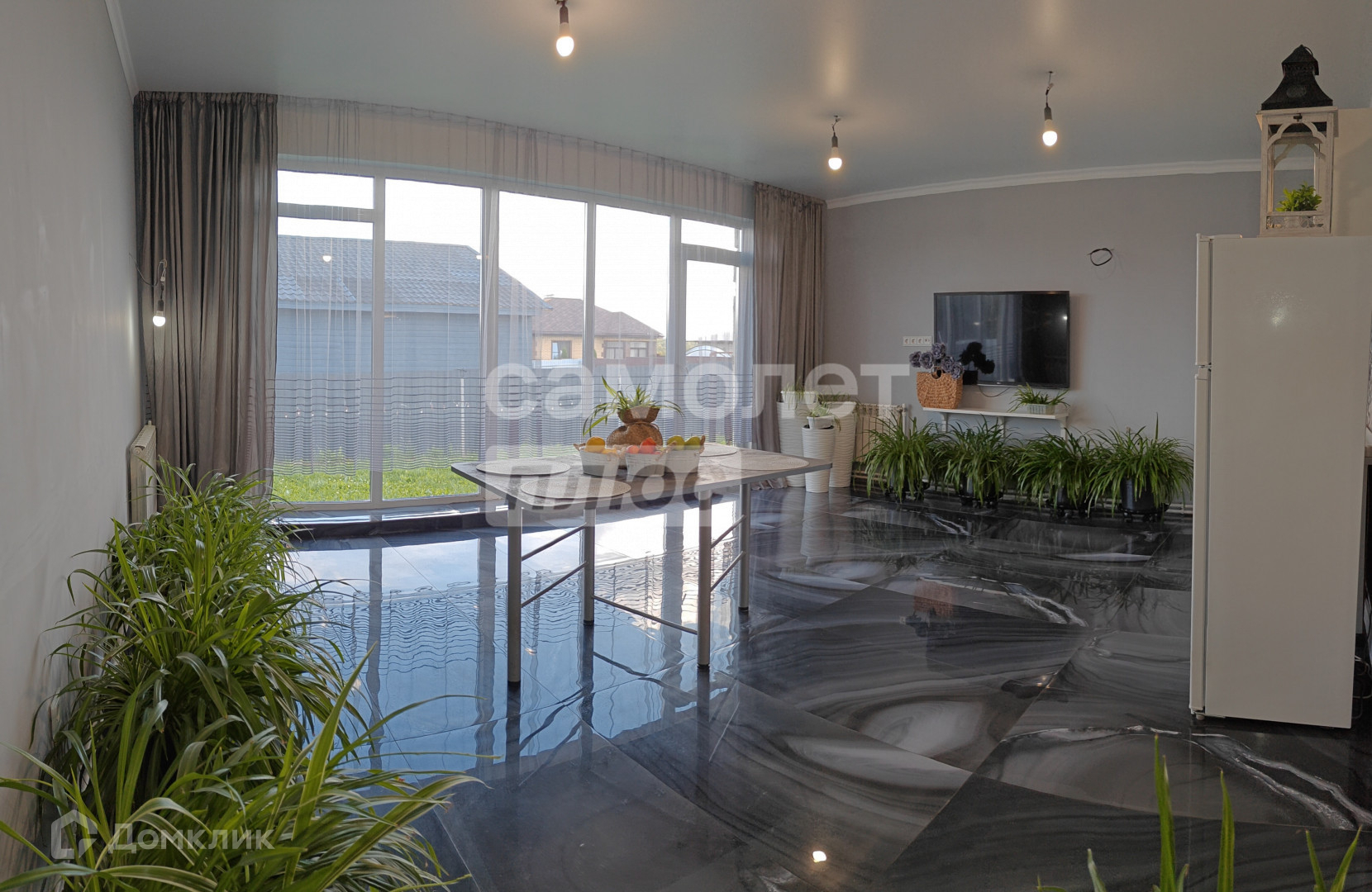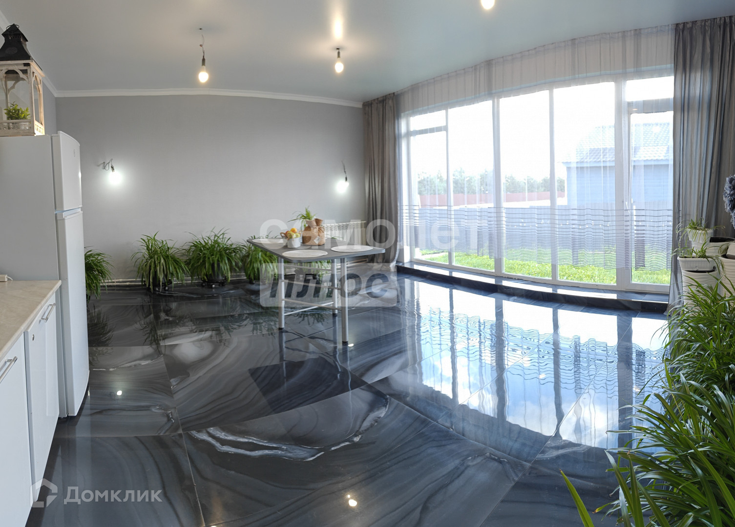 В зале-гостиной установлены большие панорамные окна в пол, которые не потеют зимой и не текут благодаря системе теплых полов. Вид из панорамных окон — на веранду (9 на 5 м).