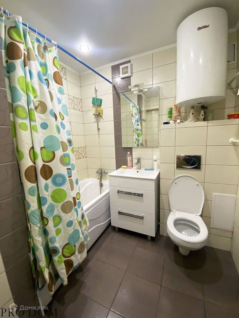 Санузел совмещён, кафель. Пол с подогревом, бойлер. Счётчик установлен на холодную воду, поменян.