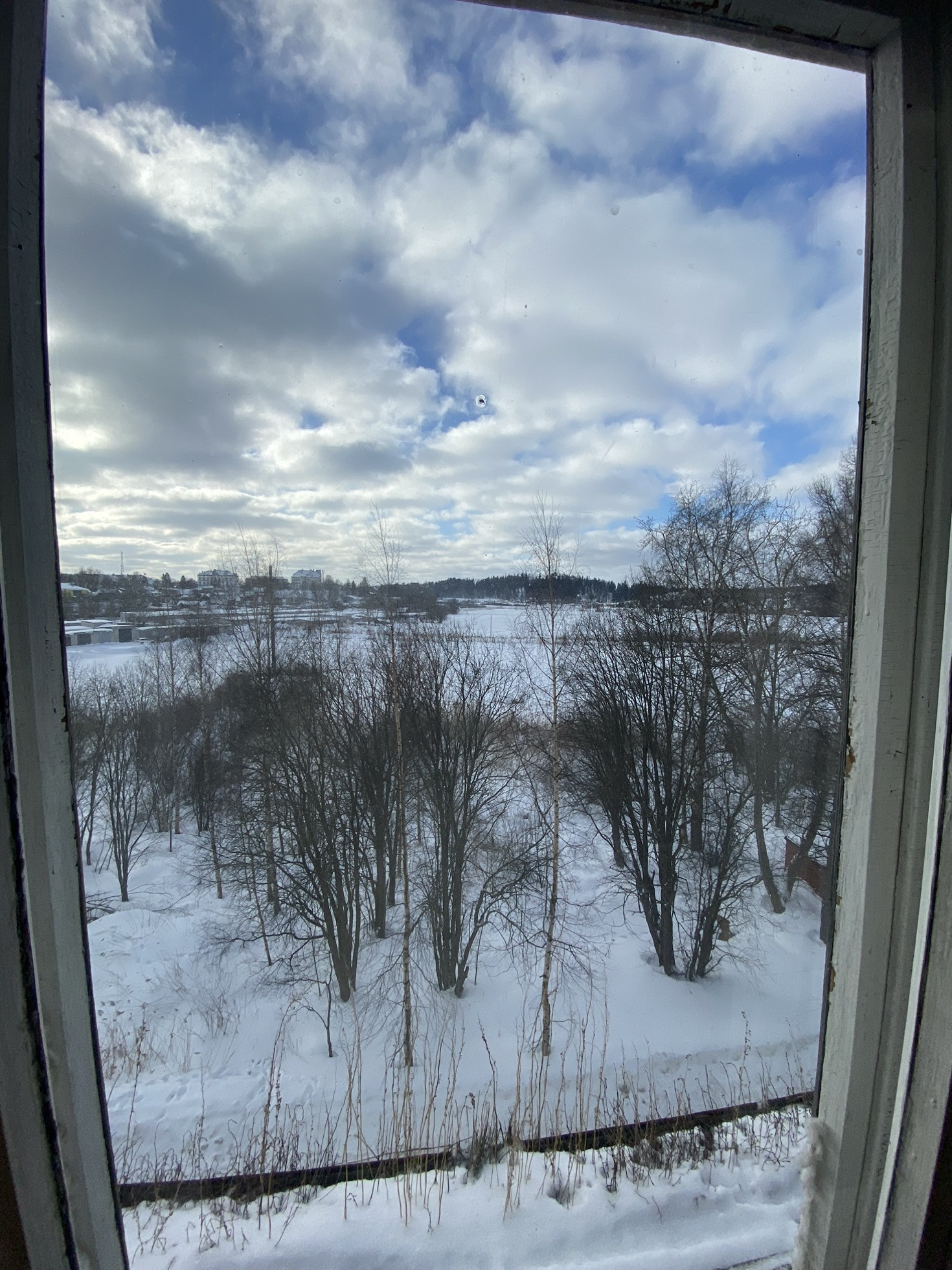 Окна на две стороны: из одной комнаты и кухни окна во двор, из другой комнаты вид на озеро Тухкалампи.