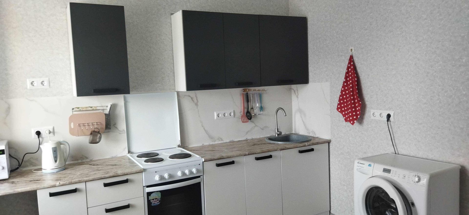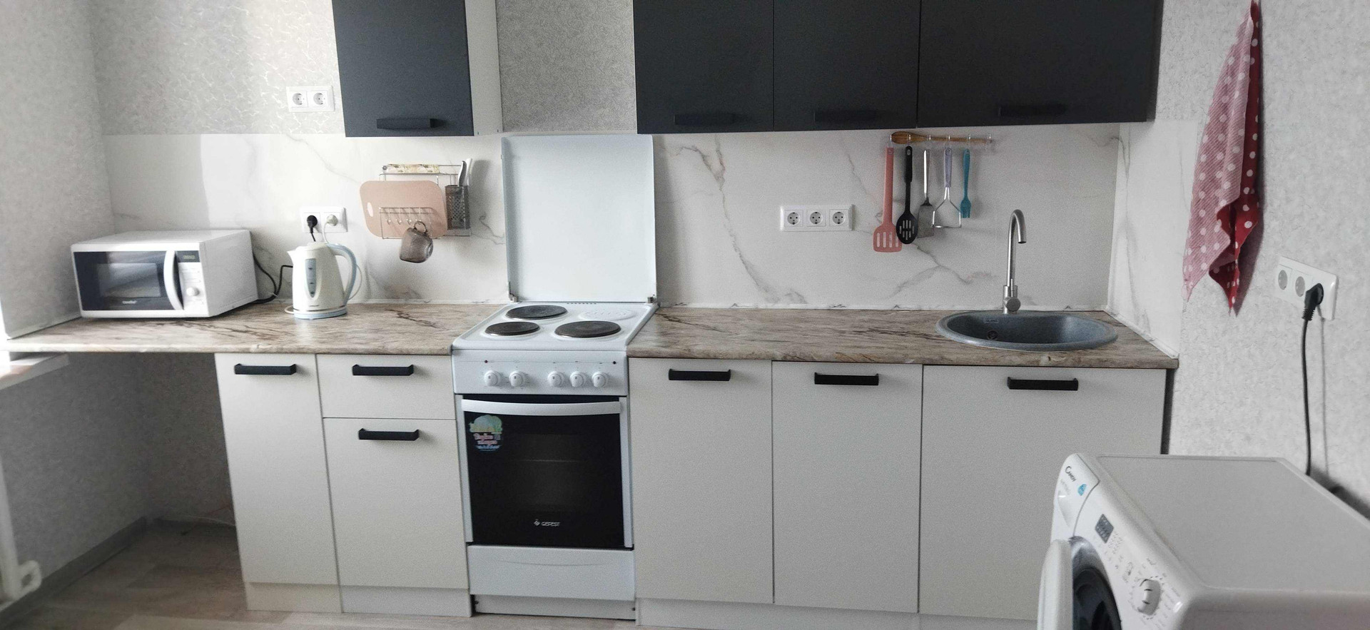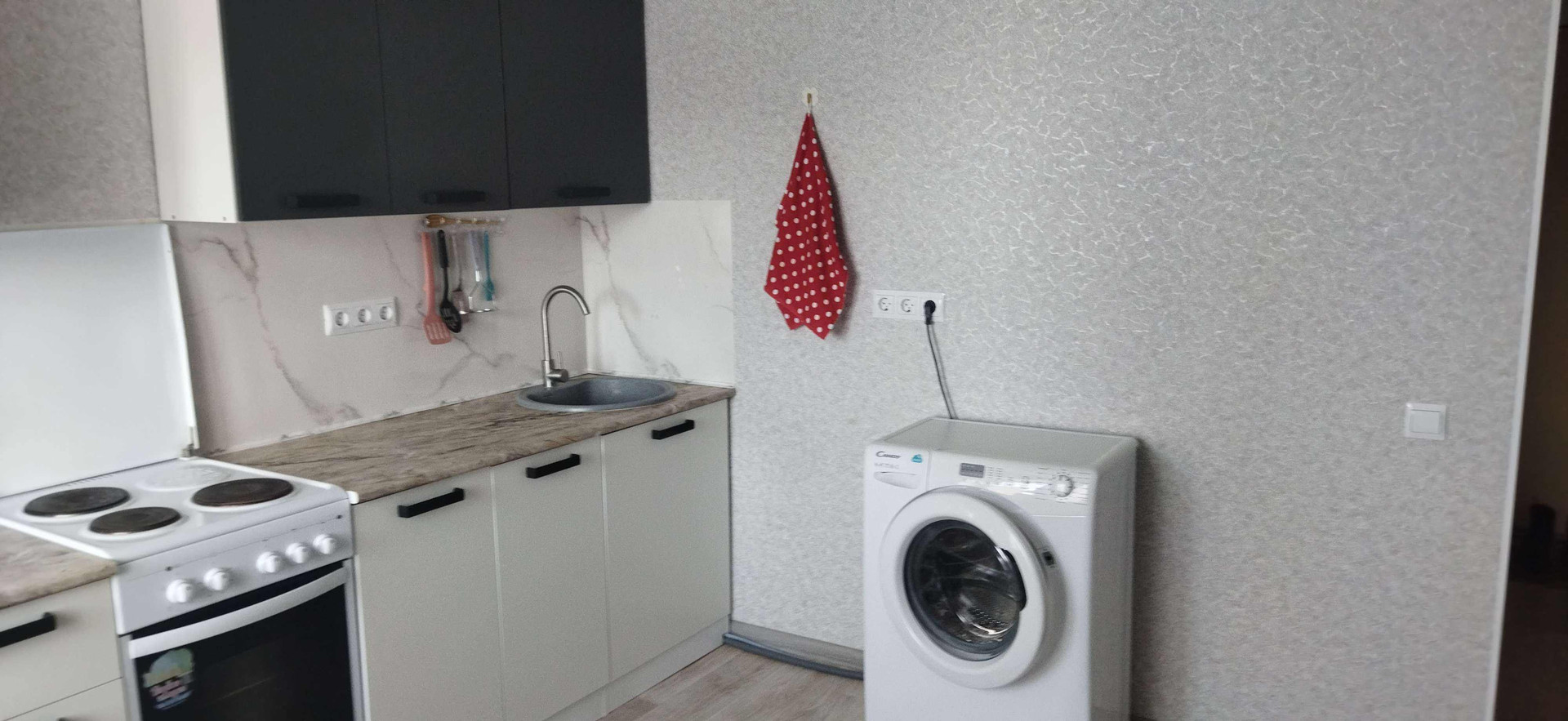 Есть общие балконы, куда можно выйти, а также -, сушить вещи. В квартире балкона нет. Электроплита новая. Окна пластиковые , выходят за дом.