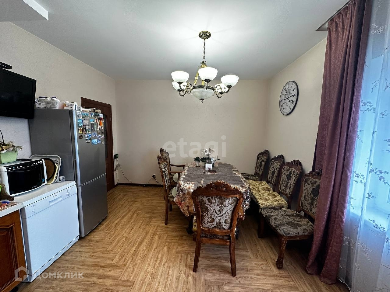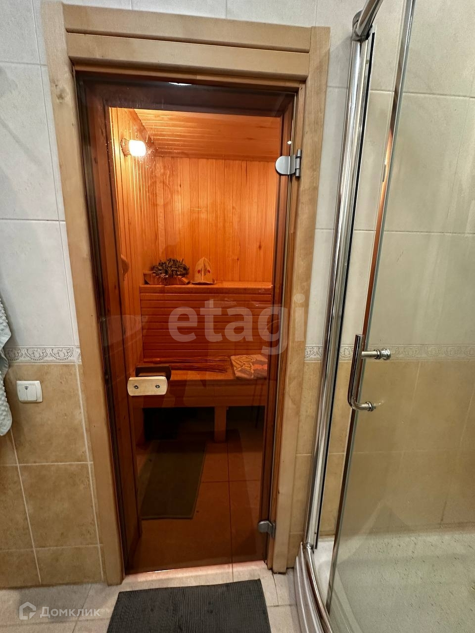На первом этаже (140 м2) прихожая, большой холл, три спальни, большая гостиная, кухня. В коридоре остается встроенный шкаф и большое безрамное зеркало. В одной из спален встроенный шкаф, во второй спальне - встроенная гардеробная. В кухне остается кухонный гарнитур со встроенной бытовой техникой и большой обеденный стол со стульями. Санузел раздельный из санузла вход в сауну. Отделка санузла: кафель и веницианская штукатурка. Полы коридор/кухня/зал - плитка ПВХ, в спальнях - ламинат. В санузле и коридоре полы с подогревом.