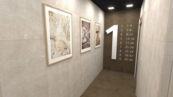 1 этаж подъездов будет отделан керамической плиткой, выше- декоративная штукатурка.