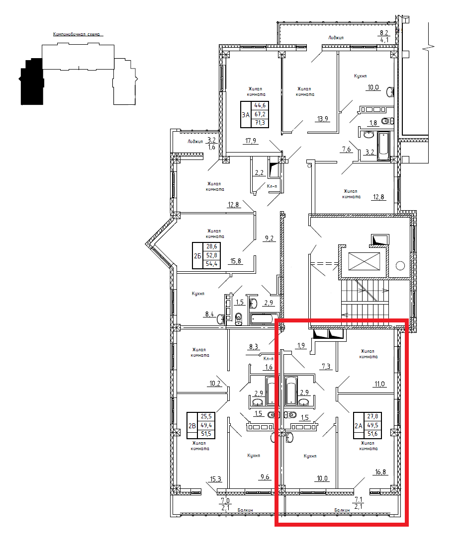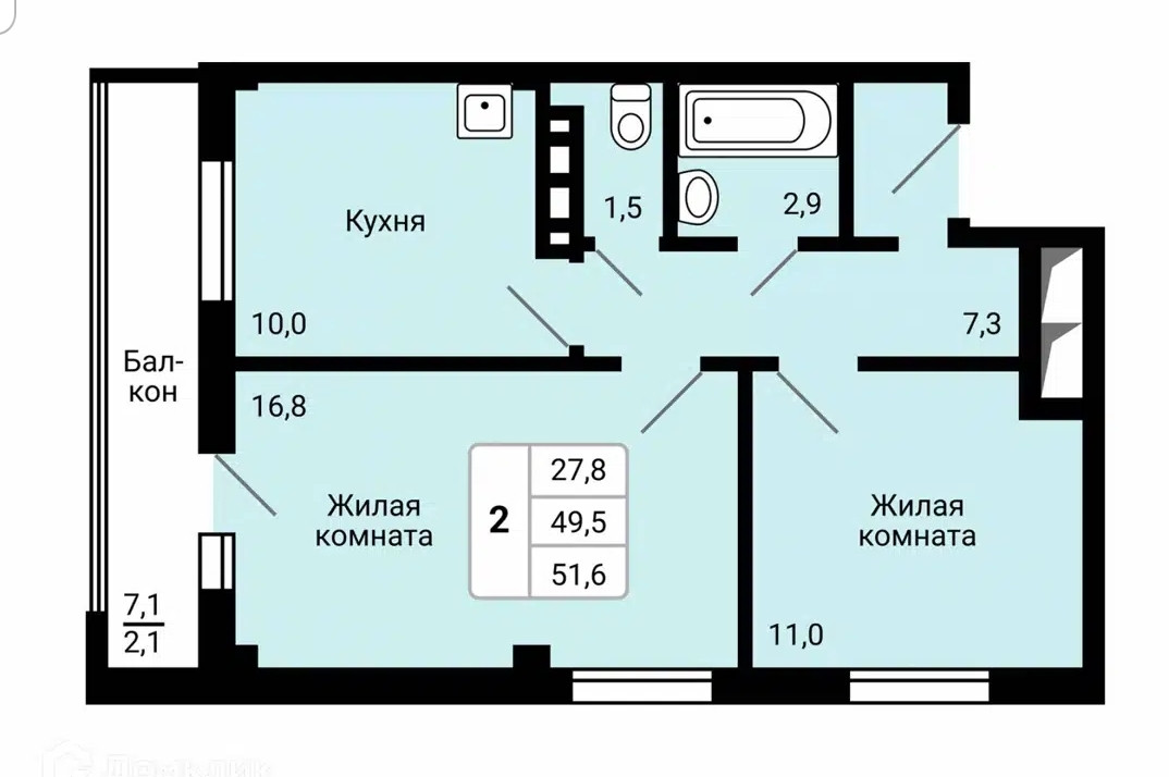 Общая площадь 51.6 м2