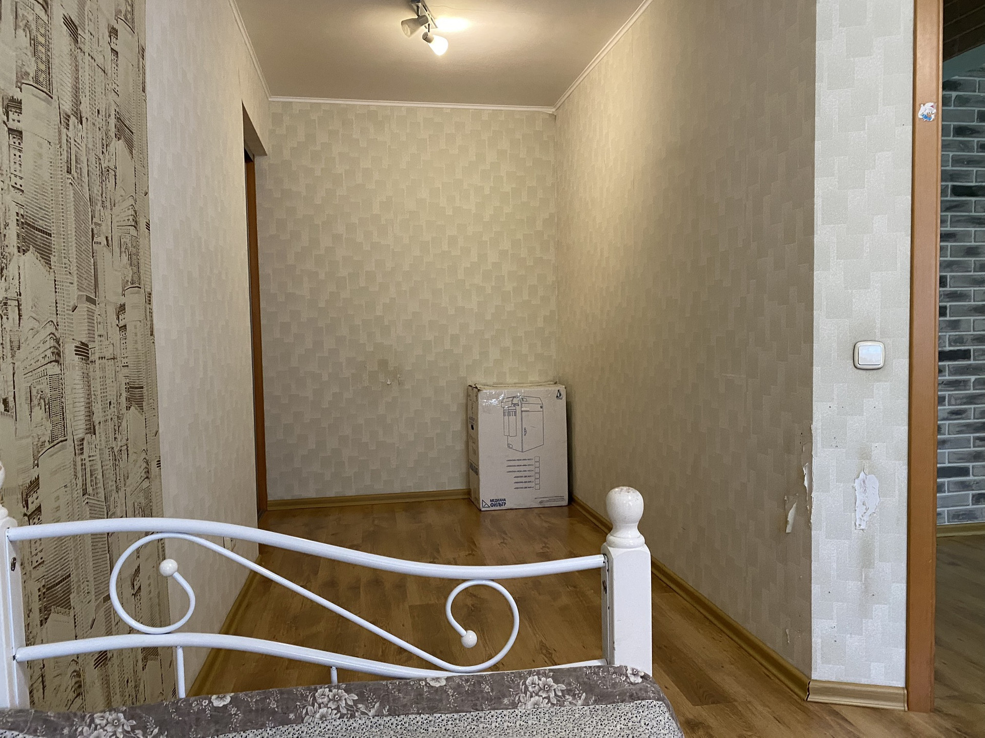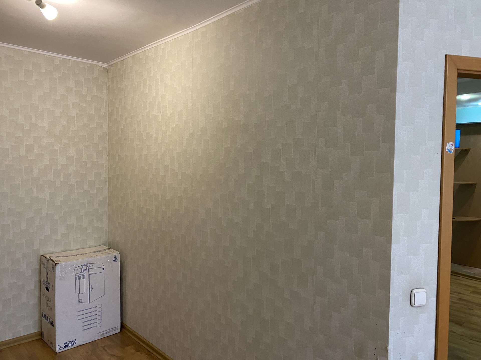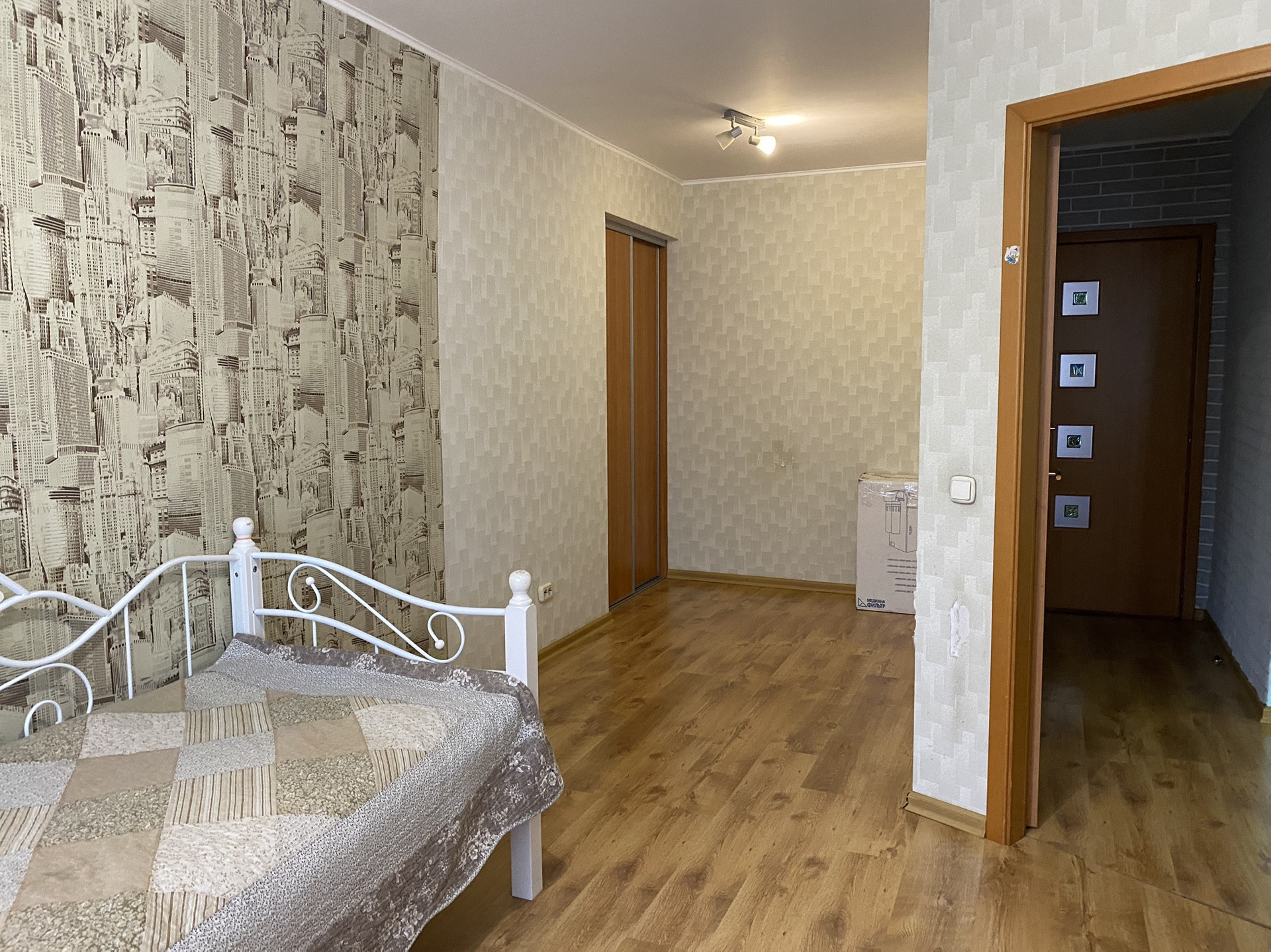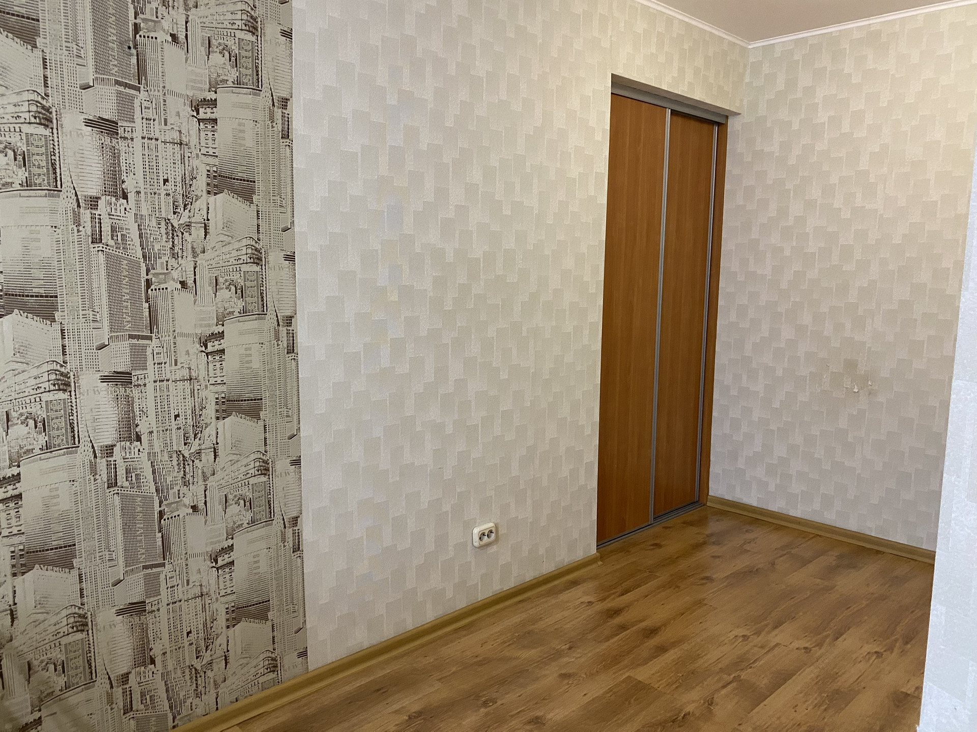 Отличное состояние, очень тёплая, шумоизоляция отличная. Полы бетон. В ванной на кухне и коридоре плитка. В зале и комнате ламинат, в спальне ковролин. В ванной тёплые полы.  Все радиаторы отопления заменены на новые чугунные. Три больших встроенных шкафа что позволяет разместить очень много вещей. Балкон остеклен. Двери межкомнатные (Италия) хоро