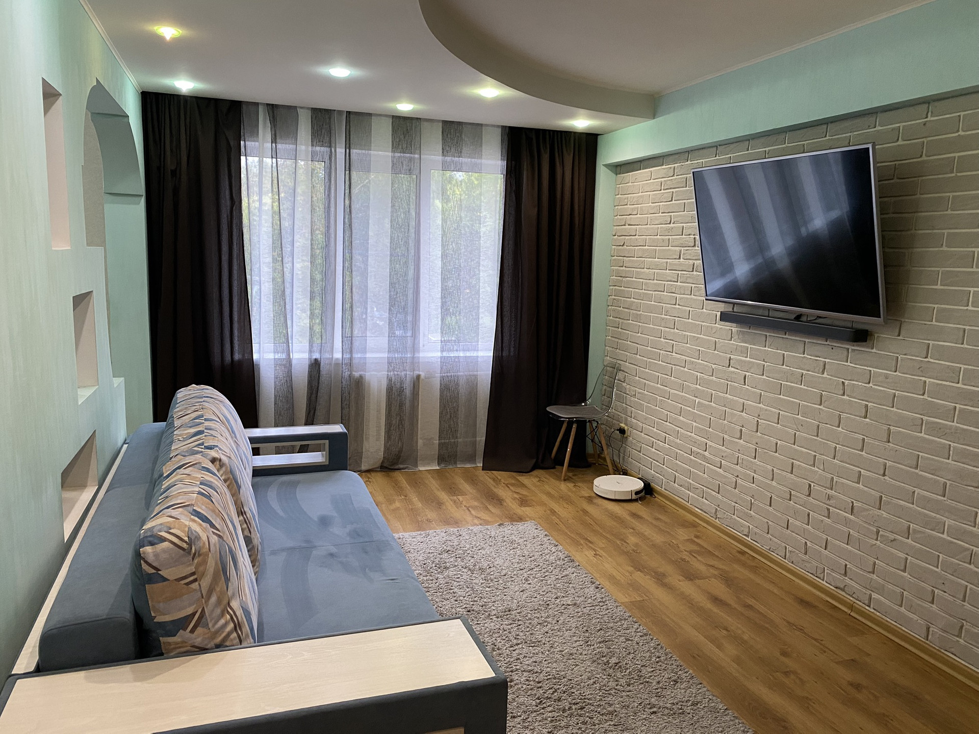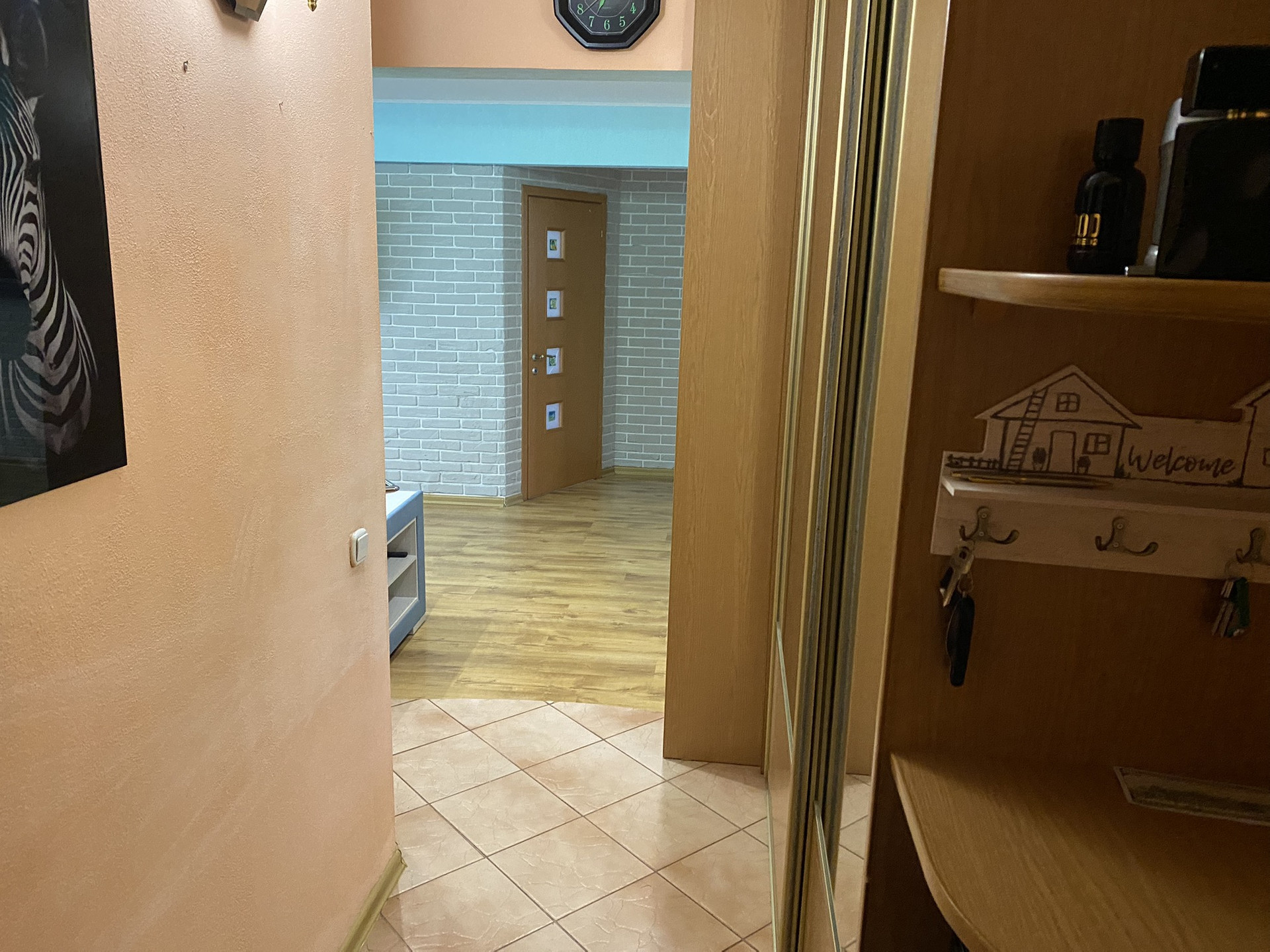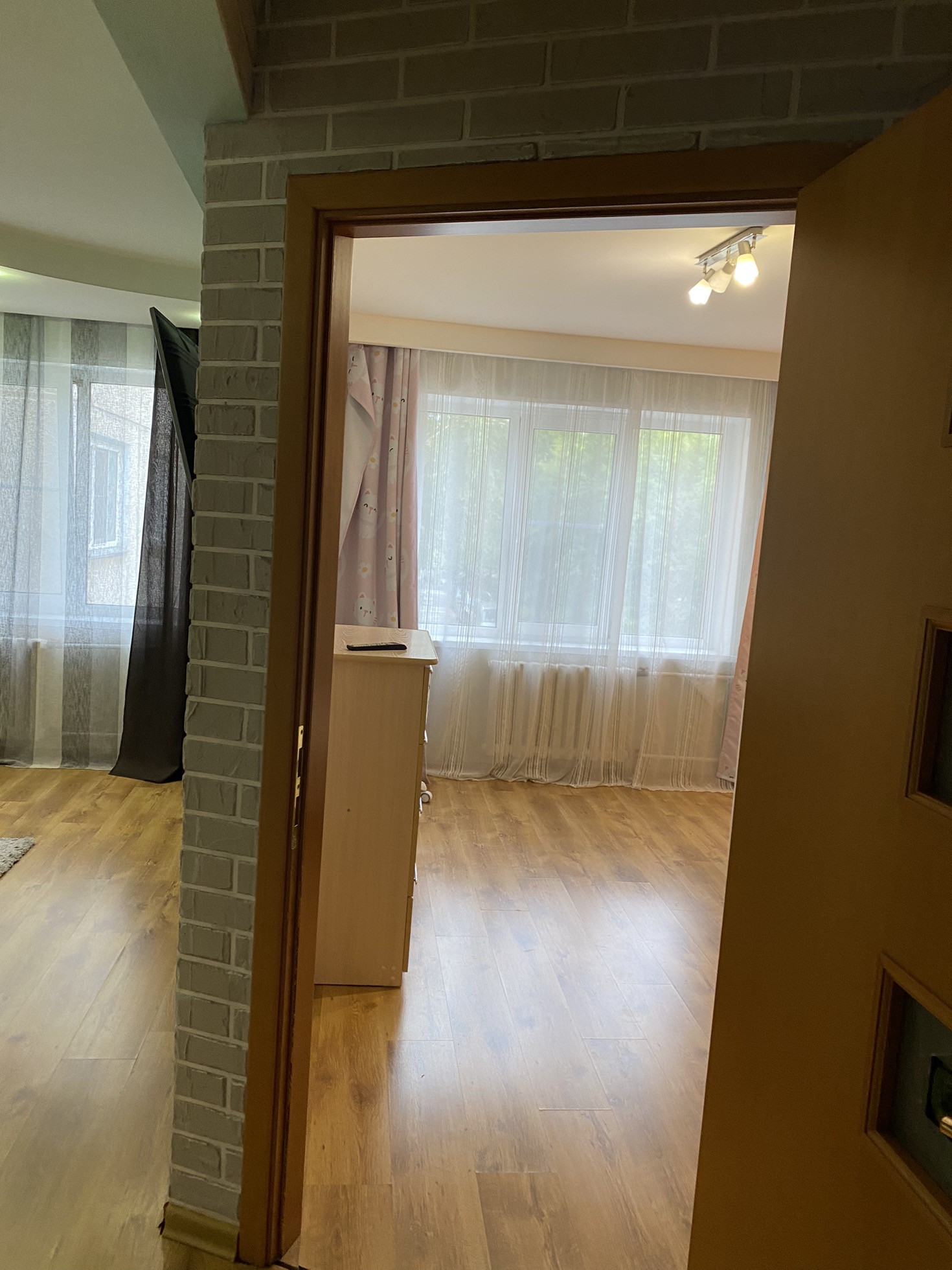 Отличное состояние, очень тёплая, шумоизоляция отличная. Полы бетон. В ванной на кухне и коридоре плитка. В зале и комнате ламинат, в спальне ковролин. В ванной тёплые полы.  Все радиаторы отопления заменены на новые чугунные. Три больших встроенных шкафа что позволяет разместить очень много вещей. Балкон остеклен. Двери межкомнатные (Италия) хоро