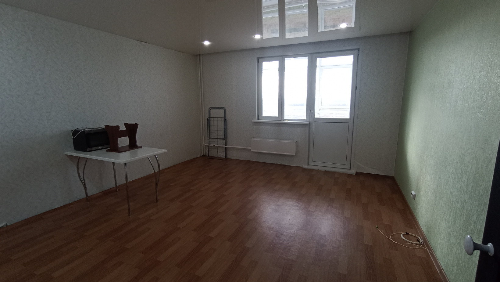 Большой балкон вo вcю ширину комнаты.