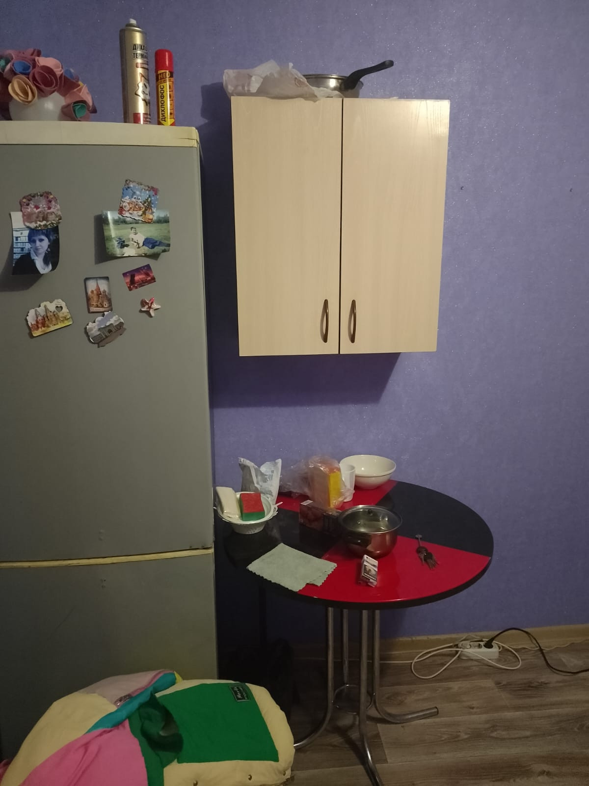 Холодильник, стол кухонный, шкафчик кухонный, раскладушка.