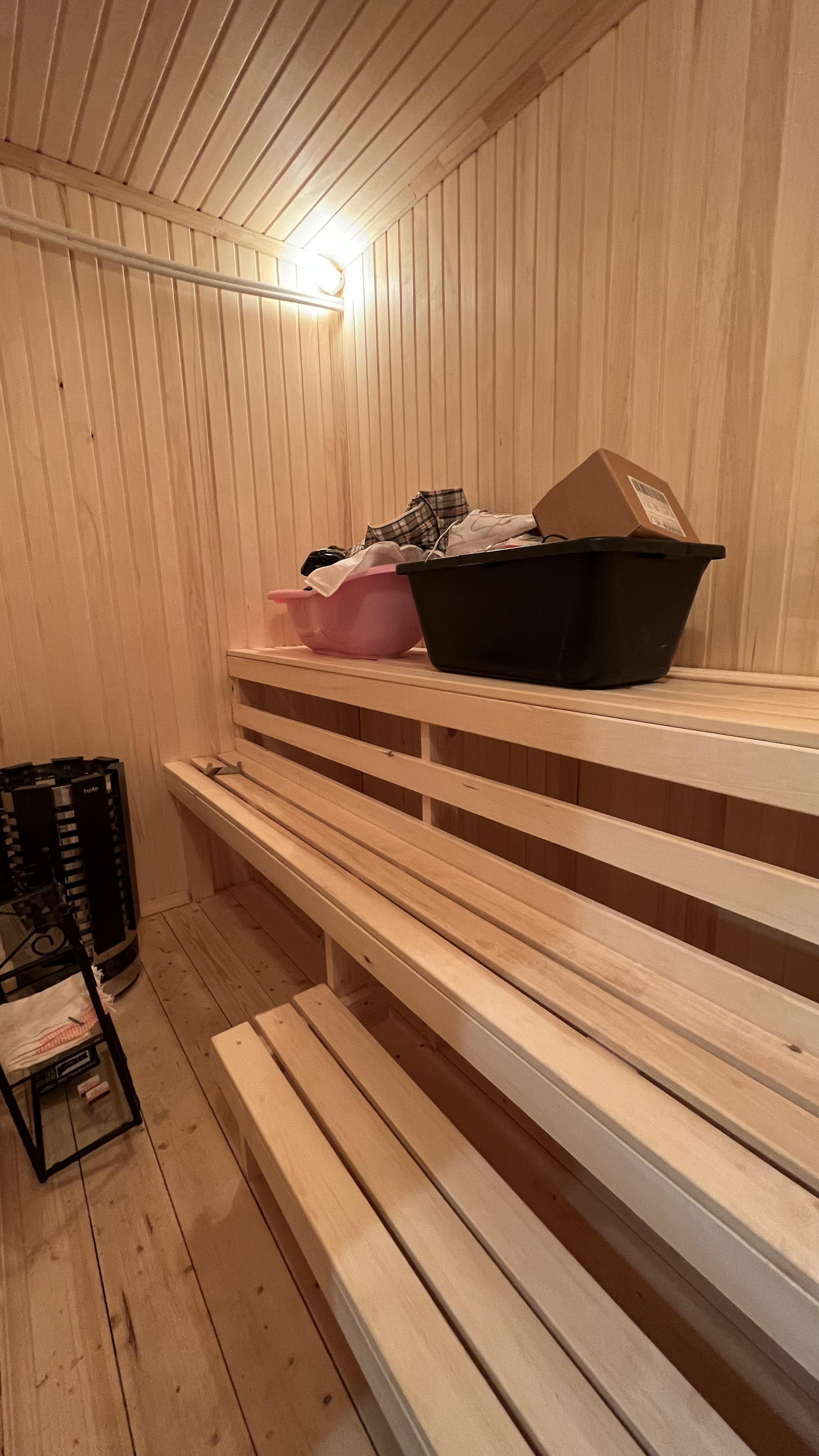 На первом этаже кухня, гостиная, холл, сауна, санузел. Достаточно просторная прихожая. Большая терраса на заднем дворе.