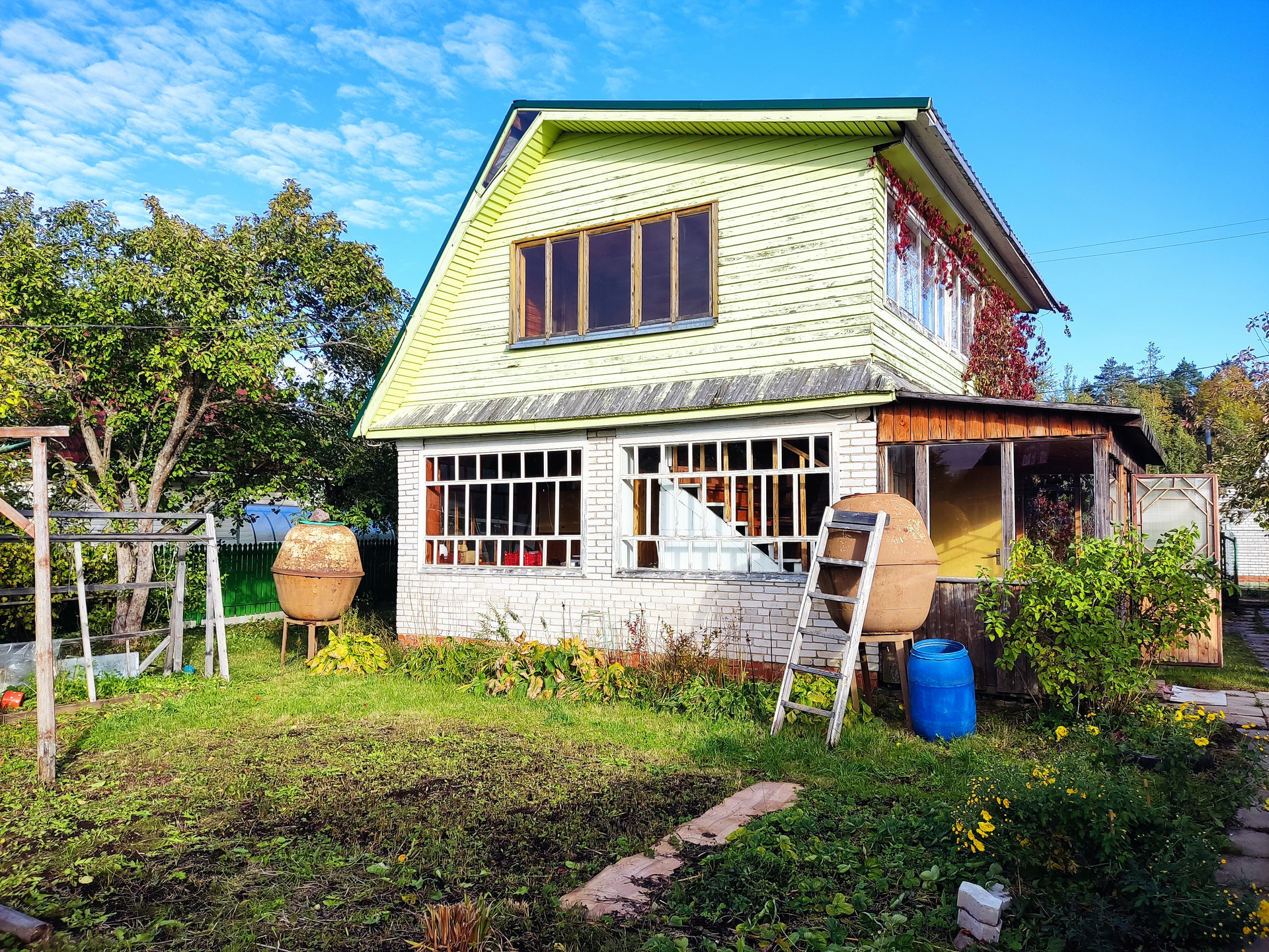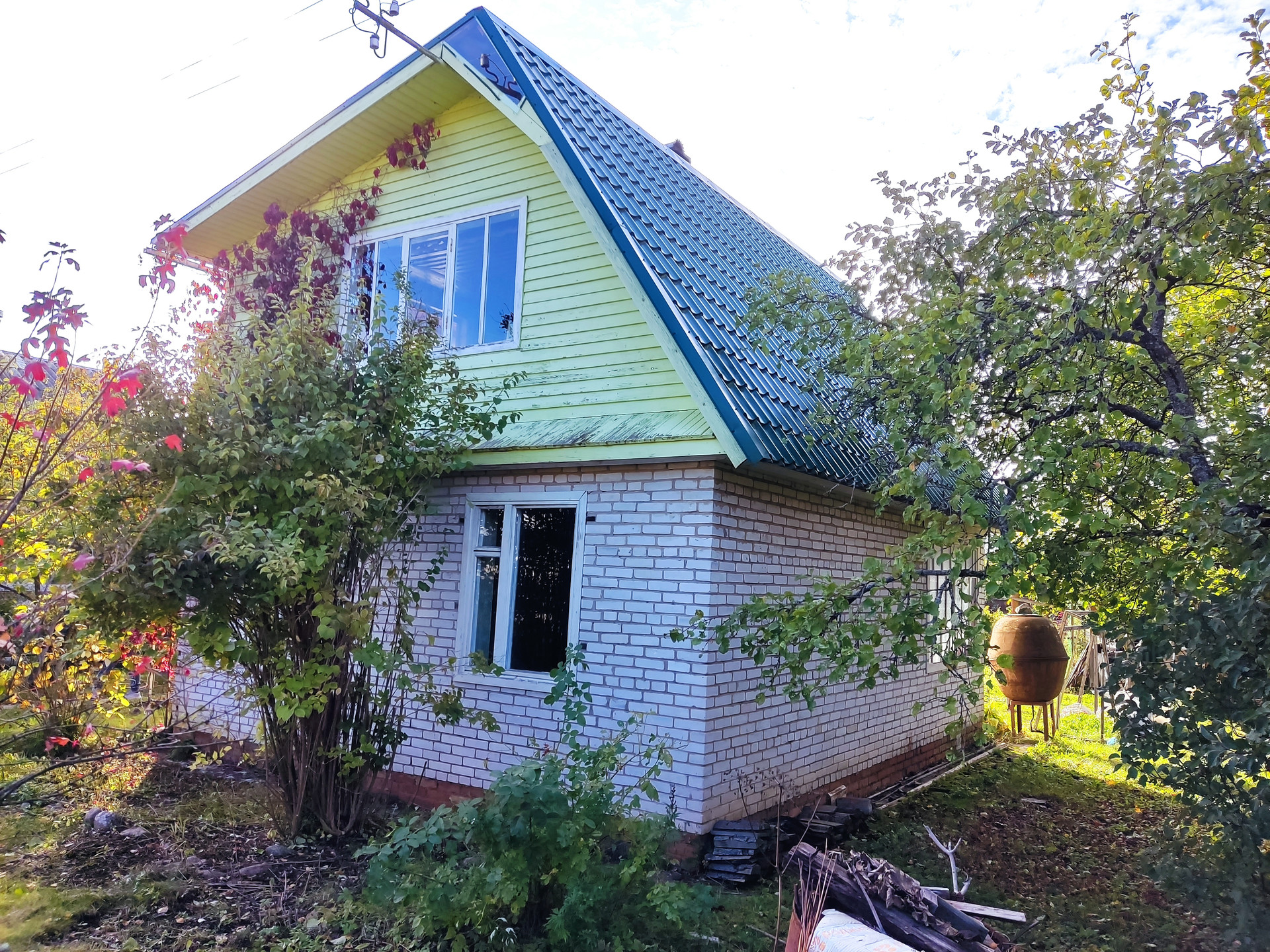 Дом 2-х этажный с верандой, 6х7 метров, кирпичный, на ленточном фундаменте. Веранда 1,9х5,1метров. На первом кухня и большая утепленная комната, отопление печь с лежанкой. На втором этаже летняя комната отдыха.