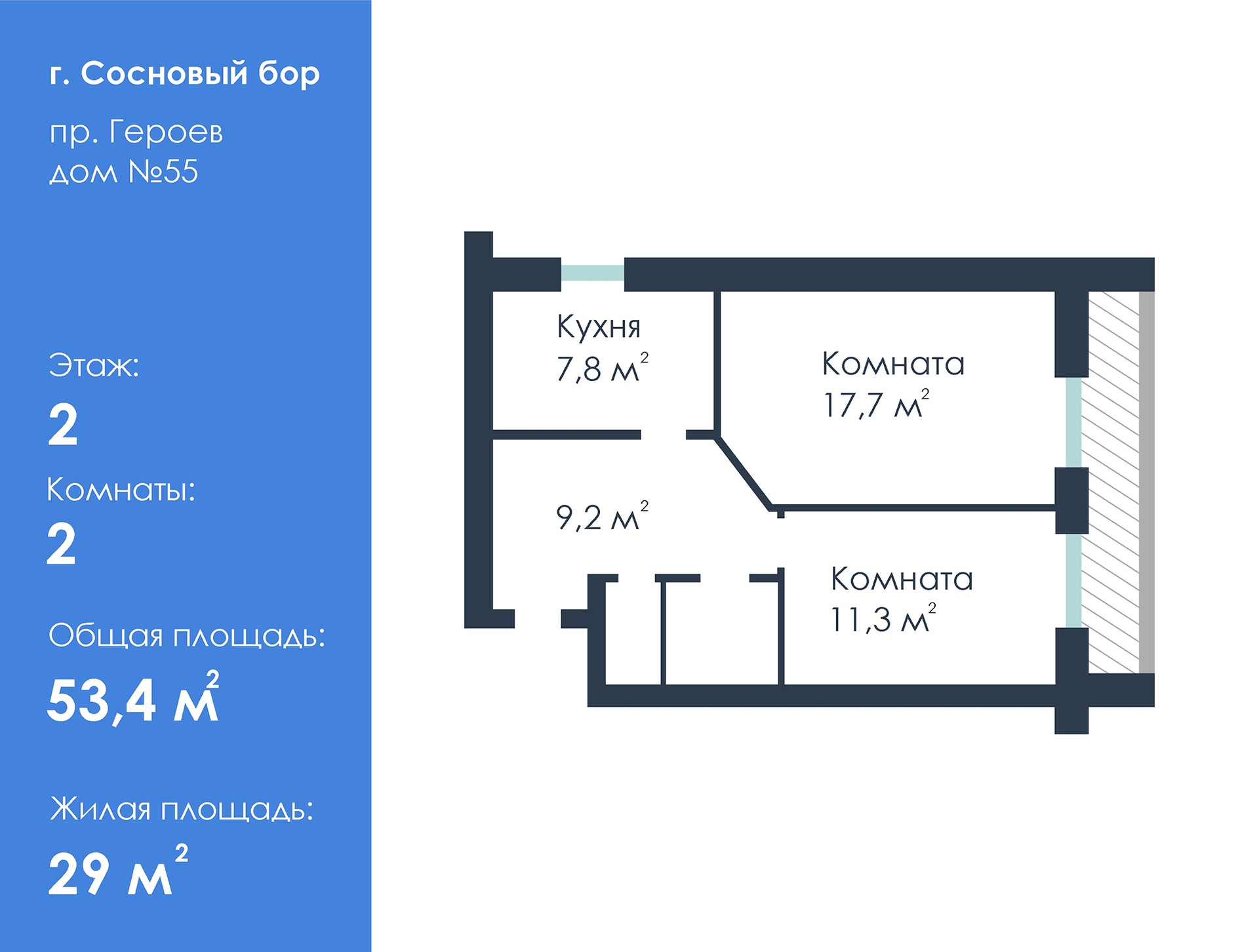 2-комнатная квартира, 50 м2, этаж 2 / 5, на продажу в Сосновом Бору, проспект Героев, 55
