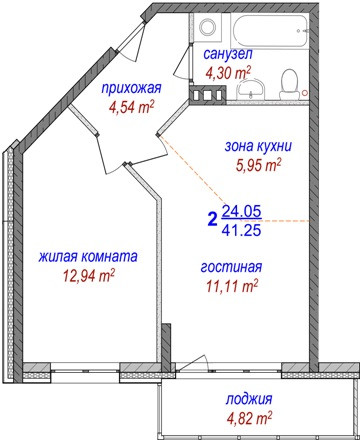 Общая площадь 41.25 м2