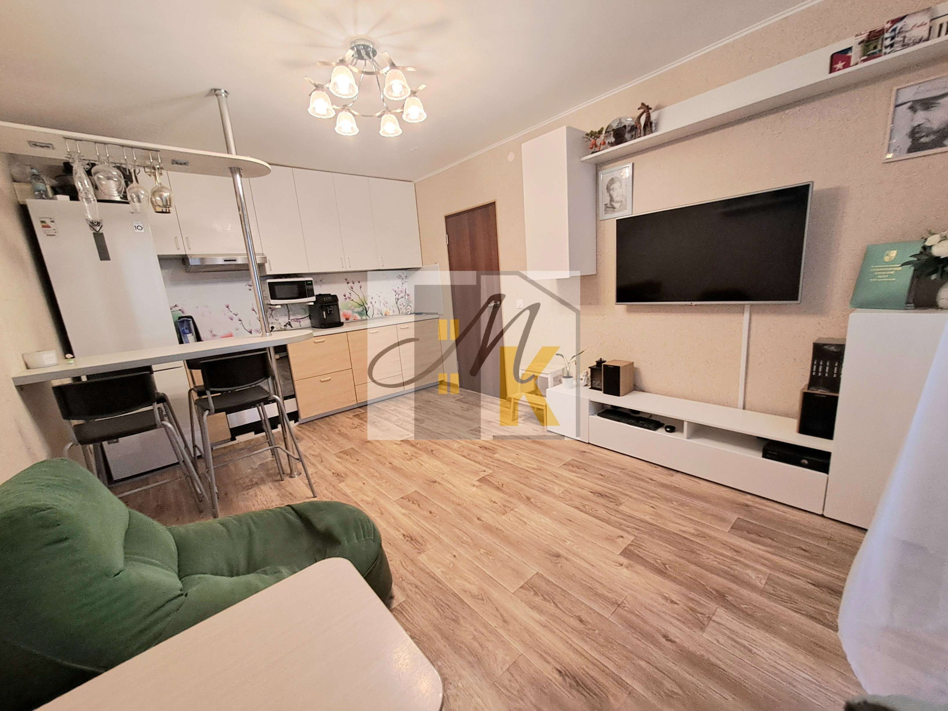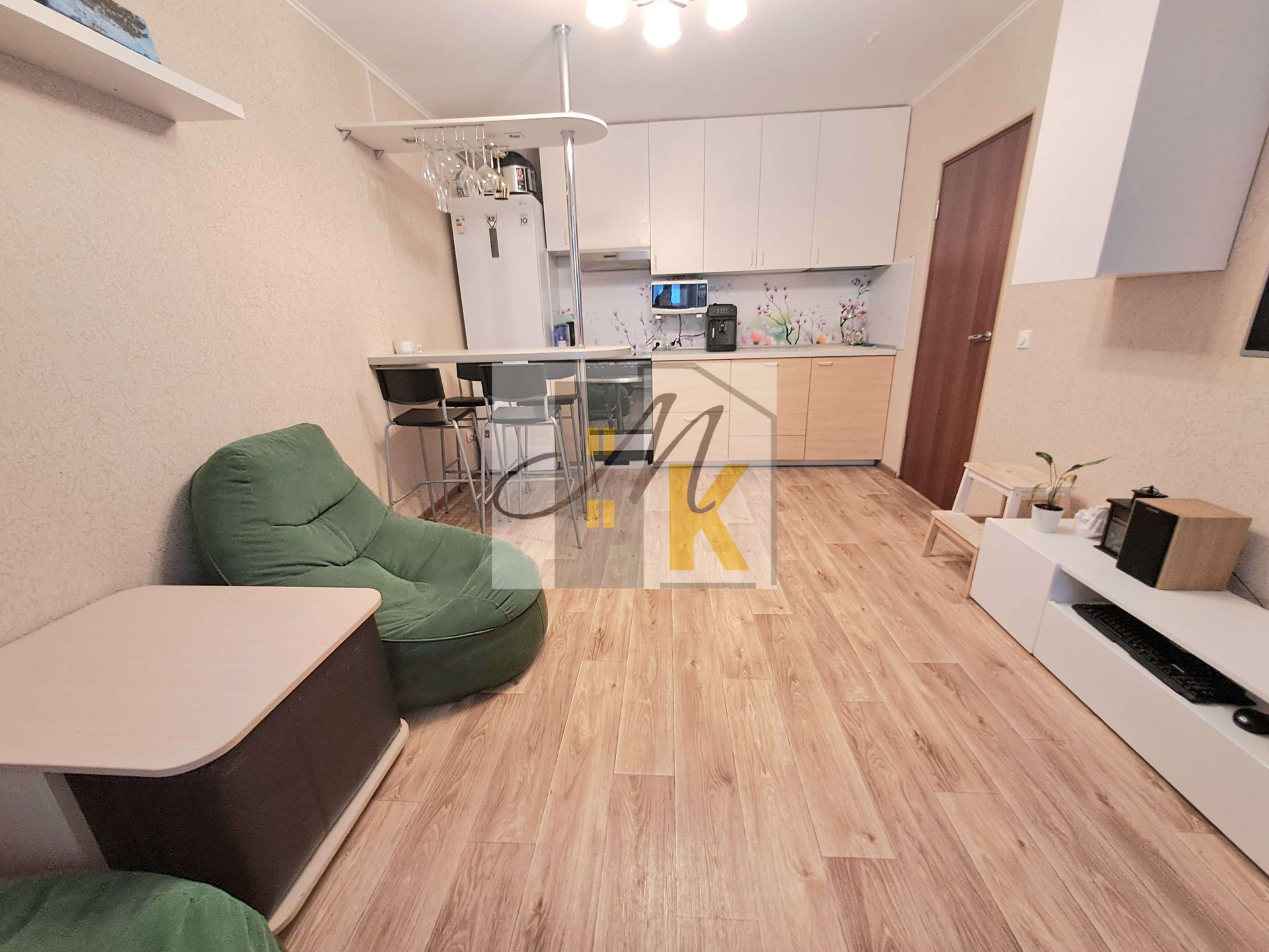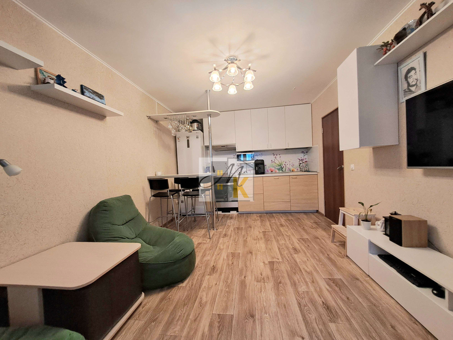 и спальный гарнитур с подъемной кроватью,что существенно делает использование площади функциональнее.Квартира светлая, окна выходят на южную сторону.Теплая.